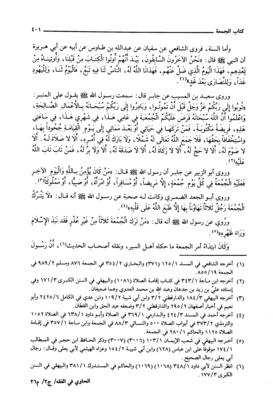 وَأَمَّا السُّنَّةُ، فَرَوَى الشَّافِعِيُّ عَنْ سُفْيَانَ عَنْ عَبْدِ اللَّهِ بْنِ طَاوُسٍ عَنْ أَبِيهِ عَنْ أَبِي هُرَيْرَةَ أَنَّ النَّبِيَّ - صَلَّى اللَّهُ عَلَيْهِ وَسَلَّم َ - قَالَ: " نَحْنُ الْآخِرُونَ السَّابِقُونَ، بَيْدَ أَنَّهُمْ أُوتُوا الْكِتَابَ مِنْ قَبْلِنَا، وَأُوتِينَاهُ مِنْ بَعْدِهِمْ، فَهَذَا الْيَوْمُ الَّذِي ضَلَّ عَنْهُمْ، فَهَدَانَا اللَّهُ لَهُ، النَّاسُ لَنَا فِيهِ تَبَعٌ، فَالْيَوْمُ لَنَا، وَلِلْيَهُودِ غَدًا، وَلِلنَّصَارَى بَعْدَ غَدٍ "