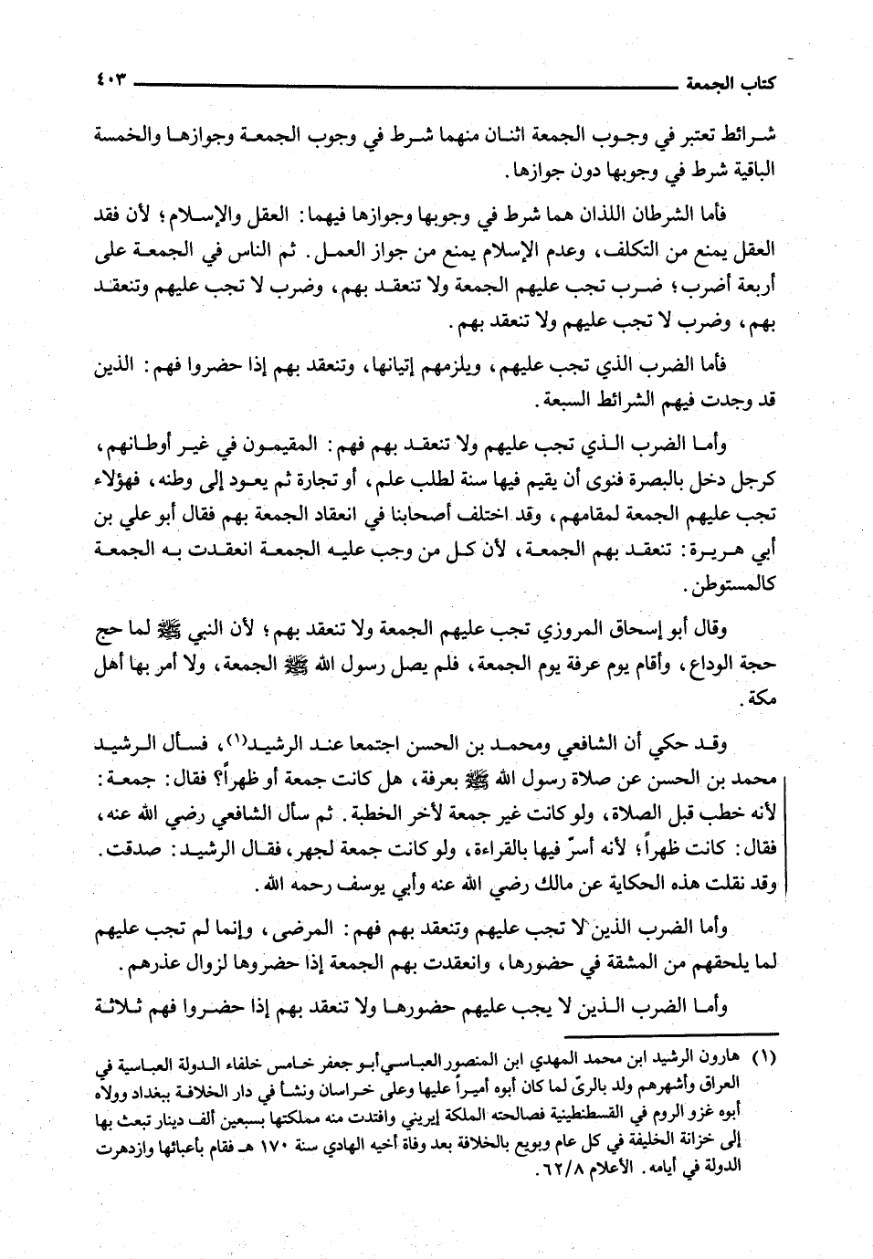 فَأَمَّا الشَّرْطَانِ اللَّذَانِ هما شرط في وجوبها وجوازها فيهما: الْعَقْلُ وَالْإِسْلَامُ؛ لِأَنَّ فَقْدَ الْعَقْلِ يُمْنَعُ مِنَ التَّكَلُّفِ، وَعَدَمَ الْإِسْلَامِ يَمْنَعُ مِنْ جَوَازِ الْعَمَلِ. ثُمَّ النَّاسُ فِي الْجُمْعَةِ عَلَى أَرْبَعَةِ أَضْرُبٍ؛ ضَرْبٌ تَجِبُ عَلَيْهِمُ الْجُمْعَةُ وَلَا تَنْعَقِدُ بِهِمْ، وَضَرْبٌ لَا تَجِبُ عَلَيْهِمْ وَتَنْعَقِدُ بِهِمْ، وَضَرْبٌ لَا تَجِبُ عَلَيْهِمْ وَلَا تَنْعَقِدُ بِهِمْ