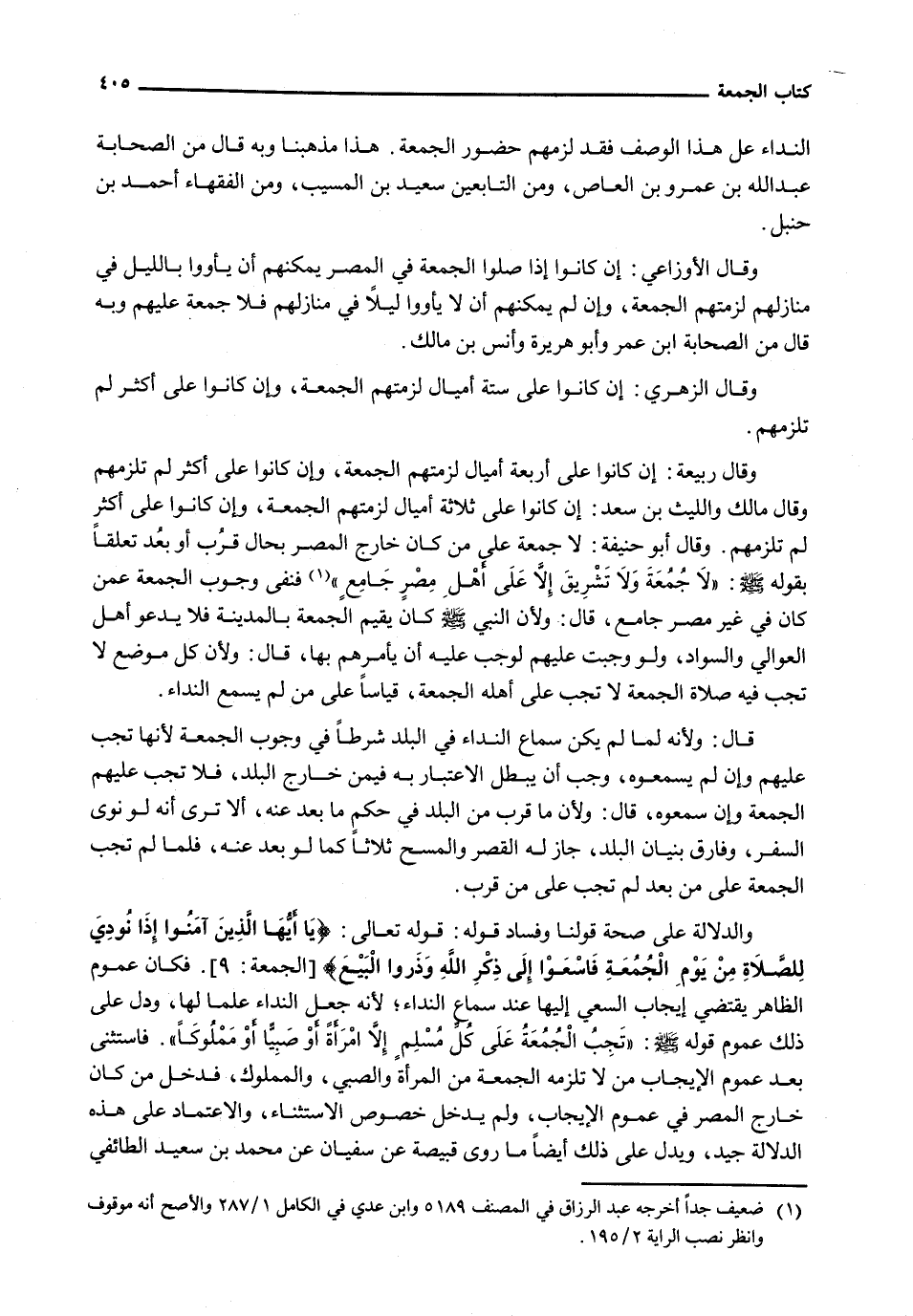 النِّدَاءَ عَلَى هَذَا الْوَصْفِ فَقَدْ لَزِمَهُمْ حُضُورُ الْجُمْعَةِ. هَذَا مَذْهَبُنَا وَبِهِ قَالَ مِنَ الصَّحَابَةِ عَبْدُ اللَّهِ بْنُ عَمْرِو بْنِ الْعَاصِ، وَمِنَ التَّابِعِينَ سَعِيدُ بْنُ الْمُسَيَّبِ، وَمِنَ الْفُقَهَاءِ أَحْمَدُ بْنُ حَنْبَلٍ