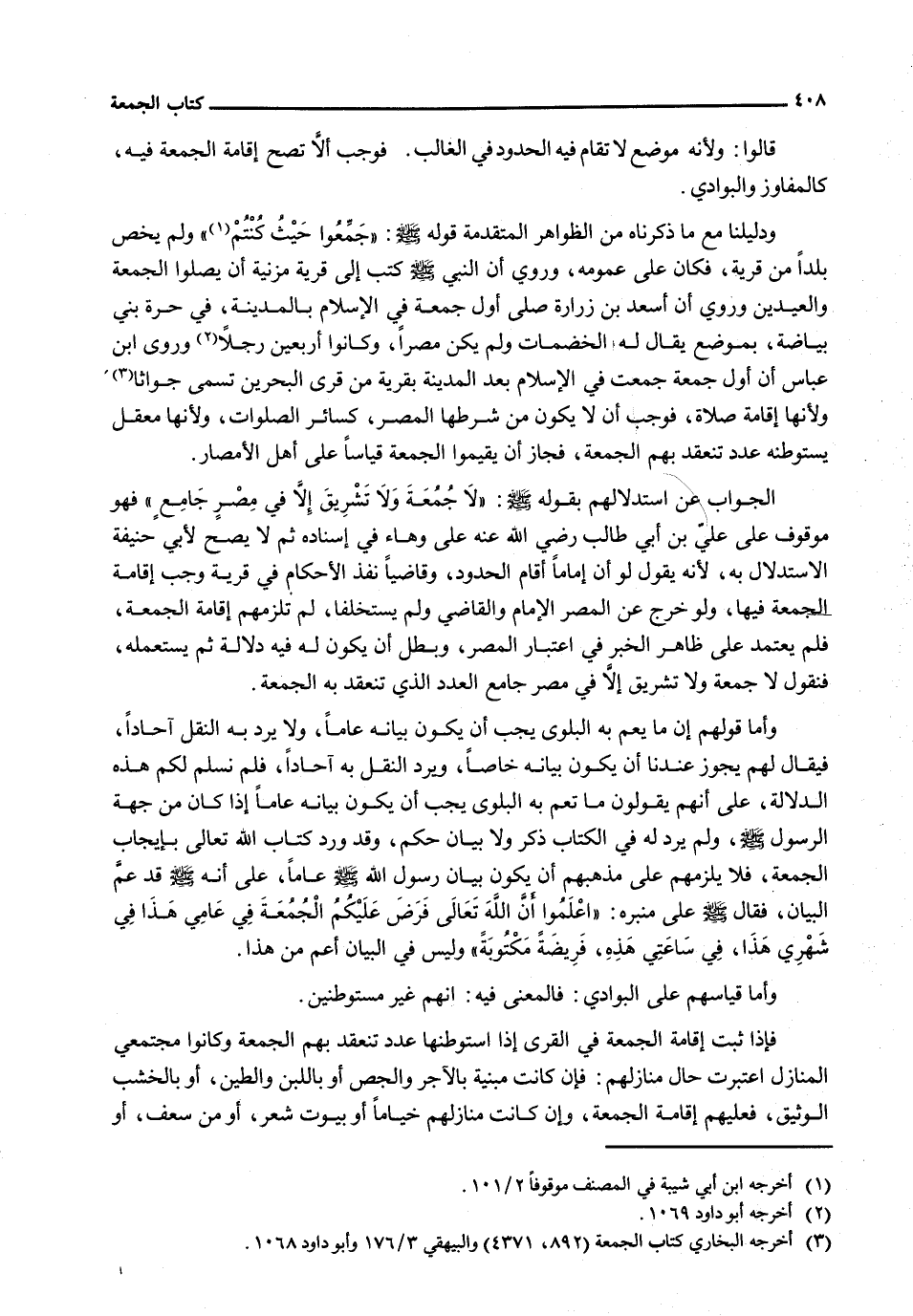 الْجَوَابُ عَنِ اسْتِدْلَالِهِمْ بِقَوْلِهِ - صَلَّى اللَّهُ عَلَيْهِ وَسَلَّم َ -: " لا جمعة ولا تشريق إلا في مصر جَامِعٍ " فَهُوَ مَوْقُوفٌ عَلَى عَلِيِّ بْنِ أَبِي طَالِبٍ رَضِيَ اللَّهُ عنه على وهاء في إسناده ثم لَا يَصِحُّ لأبي حنيفة الِاسْتِدْلَالُ بِهِ، لِأَنَّهُ يَقُولُ لَوْ أَنَّ إِمَامًا أَقَامَ الْحُدُودَ، وَقَاضِيًّا نَفَّذَ الْأَحْكَامَ فِي قَرْيَةٍ وَجَبَ إِقَامَةُ الْجُمْعَةِ فِيهَا، وَلَوْ خَرَجَ عَنِ الْمِصْرِ الْإِمَامُ وَالْقَاضِي وَلَمْ يَسْتَخْلِفَا، لَمْ تَلْزَمْهُمْ إِقَامَةُ الْجُمْعَةِ، فَلَمْ يَعْتَمِدْ عَلَى ظَاهِرِ الْخَبَرِ فِي اعْتِبَارِ الْمِصْرِ، وبطل أن يكون له فيه دلالة ثُمَّ يَسْتَعْمِلَهُ، فَنَقُولُ لَا جُمْعَةَ وَلَا تَشْرِيقَ إِلَّا فِي مِصْرٍ جَامِعٍ الْعَدَدَ الَّذِي تَنْعَقِدُ بِهِ الْجُمْعَةُ