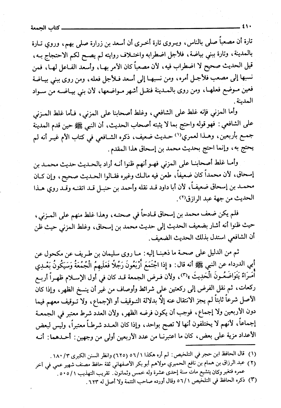 وَأَمَّا الْمُزَنِيُّ فَإِنَّهُ غَلِطَ عَلَى الشَّافِعِيِّ، وَغَلِطَ أَصْحَابُنَا عَلَى الْمُزَنِيِّ، فَأَمَّا غَلَطُ الْمُزَنِيِّ عَلَى الشَّافِعِيِّ: فَهُوَ قَوْلُهُ وَاحْتَجَّ بِمَا لَا يُثْبِتُهُ أَصْحَابُ الْحَدِيثِ، أَنَّ النبي - صَلَّى اللَّهُ عَلَيْهِ وَسَلَّم َ - حِينَ قَدِمَ الْمَدِينَةَ جَمَّعَ بِأَرْبَعِينَ، وَهَذَا لَعَمْرِي حَدِيثٌ ضَعِيفٌ، ذَكَرَهُ الشَّافِعِيُّ فِي كِتَابِ الْأُمِّ غَيْرَ أَنَّهُ لَمْ يَحْتَجَّ بِهِ، وَإِنَّمَا احْتَجَّ بِحَدِيثِ مُحَمَّدِ بْنِ إِسْحَاقَ هَذَا الْمُقَدَّمِ