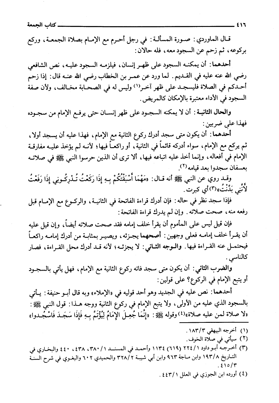 أَحَدُهُمَا: أَنْ يَكُونَ مَتَى سَجَدَ أَدْرَكَ رُكُوعَ الثَّانِيَةِ مِعِ الْإِمَامِ، فَهَذَا عَلَيْهِ أَنْ يَسْجُدَ أَوَّلًا، ثُمَّ يَرْكَعَ مَعَ الْإِمَامِ، سَوَاءٌ أَدْرَكَهُ قَائِمًا فِي الثَّانِيَةِ، أَوْ رَاكِعًا فِيهَا، لِأَنَّهُ لَمْ يُؤْخَذْ عَلَيْهِ مُفَارَقَةُ الْإِمَامِ فِي أَفْعَالِهِ، وَإِنَّمَا أُخِذَ عَلَيْهِ اتِّبَاعُهُ فِيهَا، أَلَا تَرَى أَنَّ الَّذِينَ حَرَسُوا النَّبِيَّ - صَلَّى اللَّهُ عَلَيْهِ وَسَلَّم َ - فِي صَلَاتِهِ بِعُسْفَانَ سَجَدُوا بَعْدَ قِيَامِهِ.