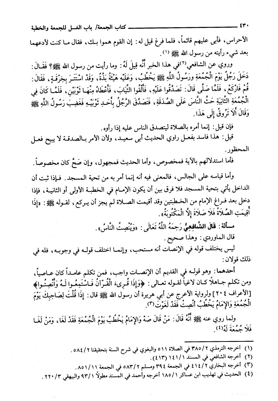 أَحَدُهُمَا: وَهُوَ قَوْلُهُ فِي الْقَدِيمِ إنَّ الْإِنْصَاتَ وَاجِبٌ، فَمَنْ تَكَلَّمَ عَامِدًا كَانَ عَاصِيًا، وَمَنْ تَكَلَّمَ جَاهِلًا كَانَ لَاغِيًا لِقَوْلِهِ تَعَالَى: {وَإِذَا قُرِئَ الْقُرْآنُ فَاسْتَمِعُوا لَهُ وَأَنْصِتُوا} [الأعراف: 204] وَلرِوَايَةِ الْأَعْرَجِ عَنْ أَبِي هُرَيْرَةَ أَنَّ رَسُولَ اللَّهِ - صَلَّى اللَّهُ عَلَيْهِ وَسَلَّم َ - قال: إذ قُلْتَ لِصَاحِبِكَ يَوْمَ الْجُمُعَةِ وَالْإِمَامُ يَخْطُبُ أَنْصِتْ فَقَدْ لَغَوْتُ.