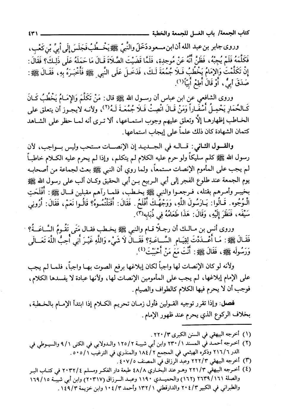 وَرَوَى الشَّافِعِيُّ عَنِ ابْنِ عَبَّاسٍ أَنَّ رَسُولَ اللَّهِ - صَلَّى اللَّهُ عَلَيْهِ وَسَلَّم َ - قَالَ: مَنْ تَكَلَّمَ وَالْإِمَامُ يَخْطُبُ كَانَ كَالْحِمَارِ يَحْمِلُ أَسْفَارًا وَمَنْ قَالَ أَنْصِتْ فَلَا جُمُعَةَ لَهُ، وَلِأَنَّهُ لَا يَجُوزُ أَنْ يَتَعَلَّقَ عَلَى الْخَاطِبِ إِظْهَارُهَا إِلَّا وَتَعَلَقَّ عَلَيْهِمْ وُجُوبُ اسْتِمَاعِهَا، أَلَا تَرَى أَنَّهُ لَمَّا حَظَرَ عَلَى الشَّاهِدِ كِتْمَانَ الشَّهَادَةِ كَانَ ذَلِكَ عَلَمًا عَلَى إِيجَابِ اسْتِمَاعِهَا.