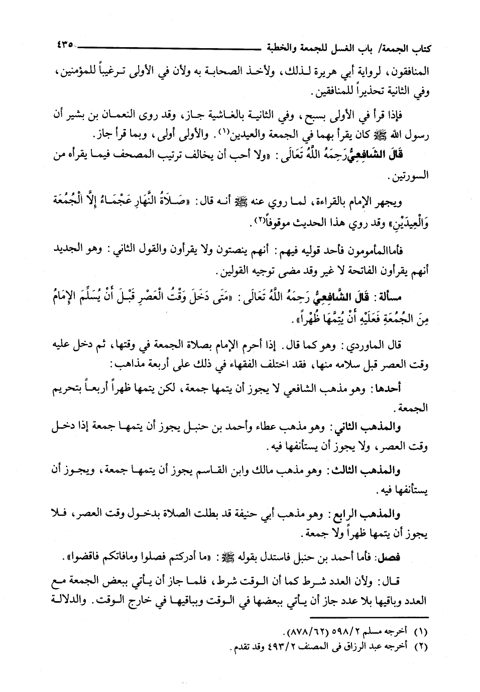الْمُنَافِقُونَ، لِرِوَايَةِ أَبِي هُرَيْرَةَ لِذَلِكَ، وَلِأَخْذِ الصَّحَابَةِ بِهِ وَلِأَنَّ فِي الْأُولَى تَرْغِيبًا لِلْمُؤْمِنِينَ، وَفِي الثَّانِيَةِ تَحْذِيرًا لِلْمُنَافِقِينَ.
