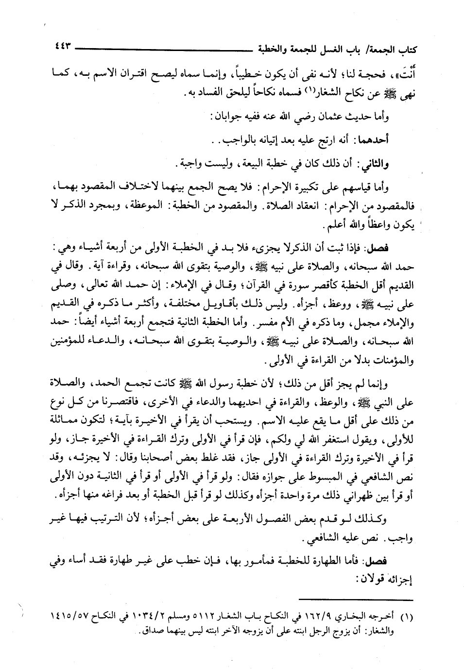 : فَإِذَا ثَبَتَ أَنَّ الذِّكْرَ لَا يُجْزِئُ فَلَا بُدَّ فِي الْخُطْبَةِ الْأُولَى مِنْ أَرْبَعَةِ أَشْيَاءَ وَهِيَ: حَمْدُ اللَّهِ سُبْحَانَهُ، وَالصَّلَاةُ عَلَى نَبِيِّهِ - صَلَّى اللَّهُ عَلَيْهِ وَسَلَّم َ -، وَالْوَصِيَّةُ بِتَقْوَى اللَّهِ سُبْحَانَهُ، وَقِرَاءَةُ آيَةٍ. وَقَالَ فِي الْقَدِيمِ أَقَلُّ الْخُطْبَةِ كَأَقْصَرِ سُورَةٍ فِي الْقُرْآنِ، وَقَالَ فِي الْإِمْلَاءِ: إِنْ حَمِدَ اللَّهَ تَعَالَى، وَصَلَّى عَلَى نَبِيِّهِ - صَلَّى اللَّهُ عَلَيْهِ وَسَلَّم َ - وَوَعَظَ، أَجْزَأَهُ. وَلَيْسَ ذَلِكَ بِأَقَاوِيلَ مُخْتَلِفَةٍ، وَأَكْثَرُ مَا ذَكَرَهُ فِي الْقَدِيمِ وَالْإِمْلَاءِ مُجْمَلٌ وَمَا ذَكَرَهُ فِي الْأُمِّ مُفَسَّرٌ. وَأَمَّا الْخُطْبَةُ الثَّانِيَةُ فَتَجْمَعُ أَرْبَعَةَ أَشْيَاءَ أَيْضًا: حَمْدُ اللَّهِ سُبْحَانَهُ، وَالصَّلَاةُ عَلَى نَبِيِّهِ - صَلَّى اللَّهُ عَلَيْهِ وَسَلَّم َ -، وَالْوَصِيَّةُ بِتَقْوَى اللَّهِ سُبْحَانَهُ، وَالدُّعَاءُ لِلْمُؤْمِنِينَ وَالْمُؤْمِنَاتِ بَدَلًا مِنَ الْقِرَاءَةِ فِي الْأُولَى.
