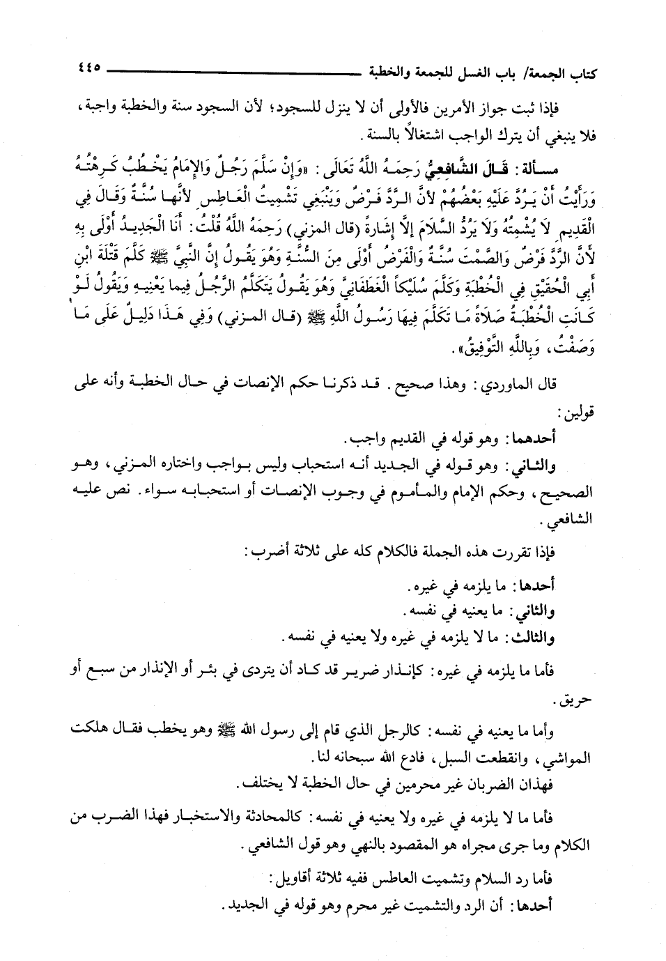 : قال الشافعي رحمه الله تعالى: " وَإِنْ سَلَّمَ رَجُلٌ وَالْإِمَامُ يَخْطُبُ كَرِهْتُهُ وَرَأَيْتُ أَنْ يَرُدَّ عَلَيْهِ بَعْضُهُمْ لِأَنَّ الرَّدَّ فَرْضٌ وينبغي تشميت العاطس لأنها سنة وقال في القديم لا يشمته ولا يرد السلام إلا إشارة (قال المزني) رحمه الله قلت: أنا الجديد أولى به لأن الرد فرض والصمت سنة والفرض أولى من السنة وهو يقول إن النبي - صَلَّى اللَّهُ عَلَيْهِ وَسَلَّم َ - كلم قتله ابن أبي الحقيق في الخطبة وكلم سليكا الغطفاني وهو يقول يتكلم الرجل فيما يعنيه ويقول لو كانت الخطبة صلاة ما تكلم فِيهَا رَسُولُ اللَّهِ - صَلَّى اللَّهُ عَلَيْهِ وَسَلَّم َ - (قال المزني) وفي هذا دليل على وما وصفت، وبالله التوفيق ".
