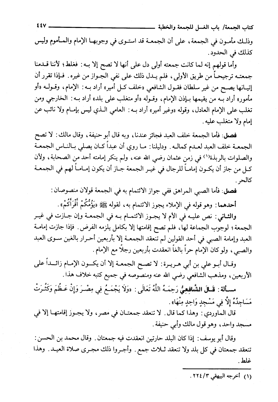: قال الشافعي رحمه الله تعالى: " وَلَا يُجَمَّعُ فِي مِصْرٍ وَإِنْ عَظُمَ وَكَثُرَتْ مَسَاجِدُهُ إِلَّا فِي مَسْجِدٍ وَاحِدٍ مِنْهَا ".