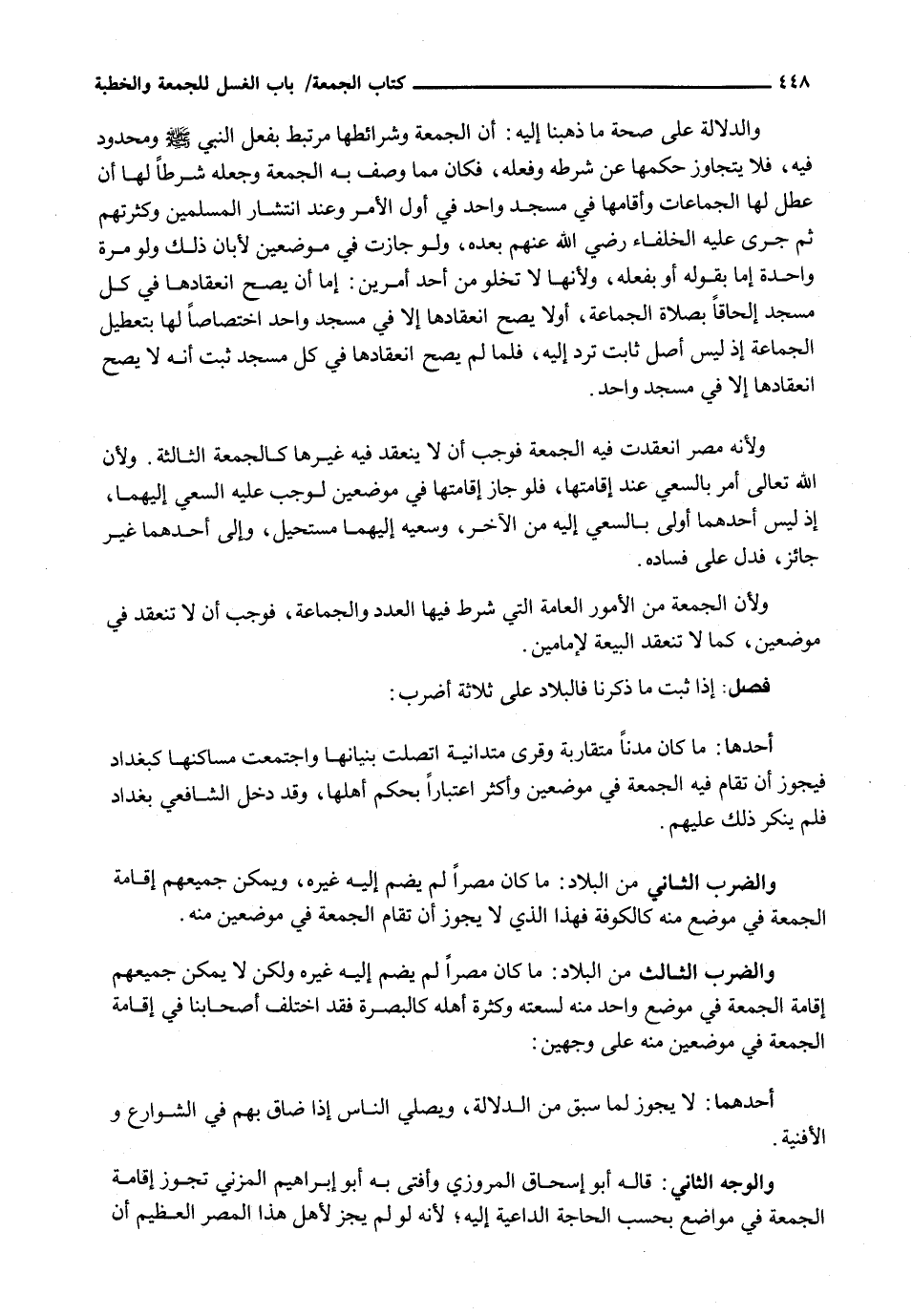 أَحَدُهَا: مَا كَانَ مُدُنًا مُتَقَارِبَةً وَقُرًى مُتَدَانِيَةً اتَّصَلَتْ بُنْيَانُهَا وَاجْتَمَعَتْ مَسَاكِنُهَا كَبَغْدَادَ فَيَجُوزُ أَنْ تُقَامَ فِيهِ الْجُمْعَةُ فِي مَوْضِعَيْنِ وَأَكْثَرَ اعْتِبَارًا بِحُكْمِ أَهْلِهَا، وَقَدْ دَخَلَ الشَّافِعِيُّ بَغْدَادَ فَلَمْ يُنْكِرْ ذَلِكَ عَلَيْهِمْ.