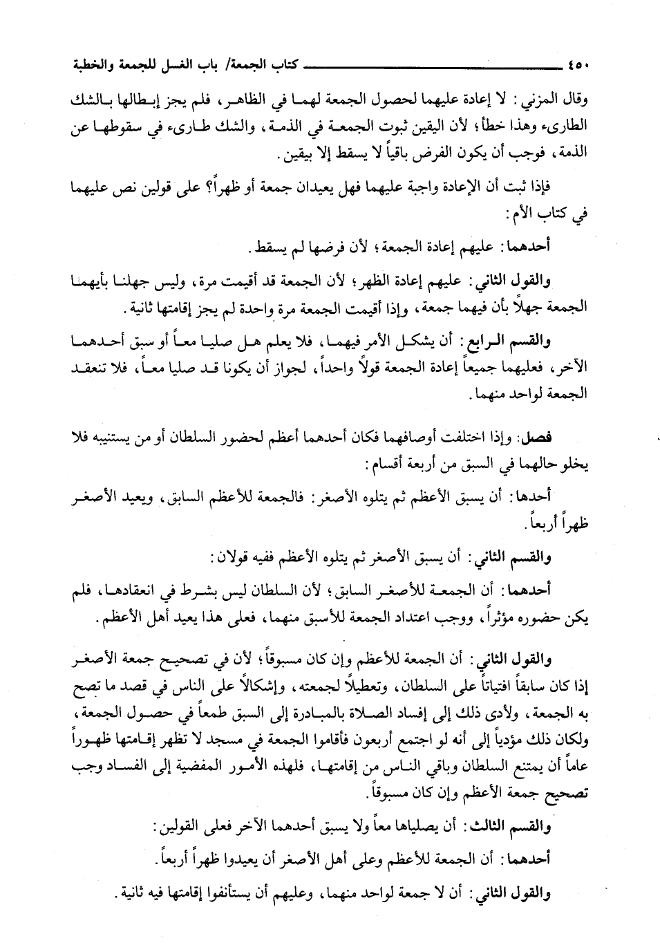 أَحَدُهُمَا: أَنَّ الْجُمْعَةَ لِلْأَعْظَمِ وَعَلَى أَهْلِ الْأَصْغَرِ أَنْ يُعِيدُوا ظُهْرًا أَرْبَعًا.
