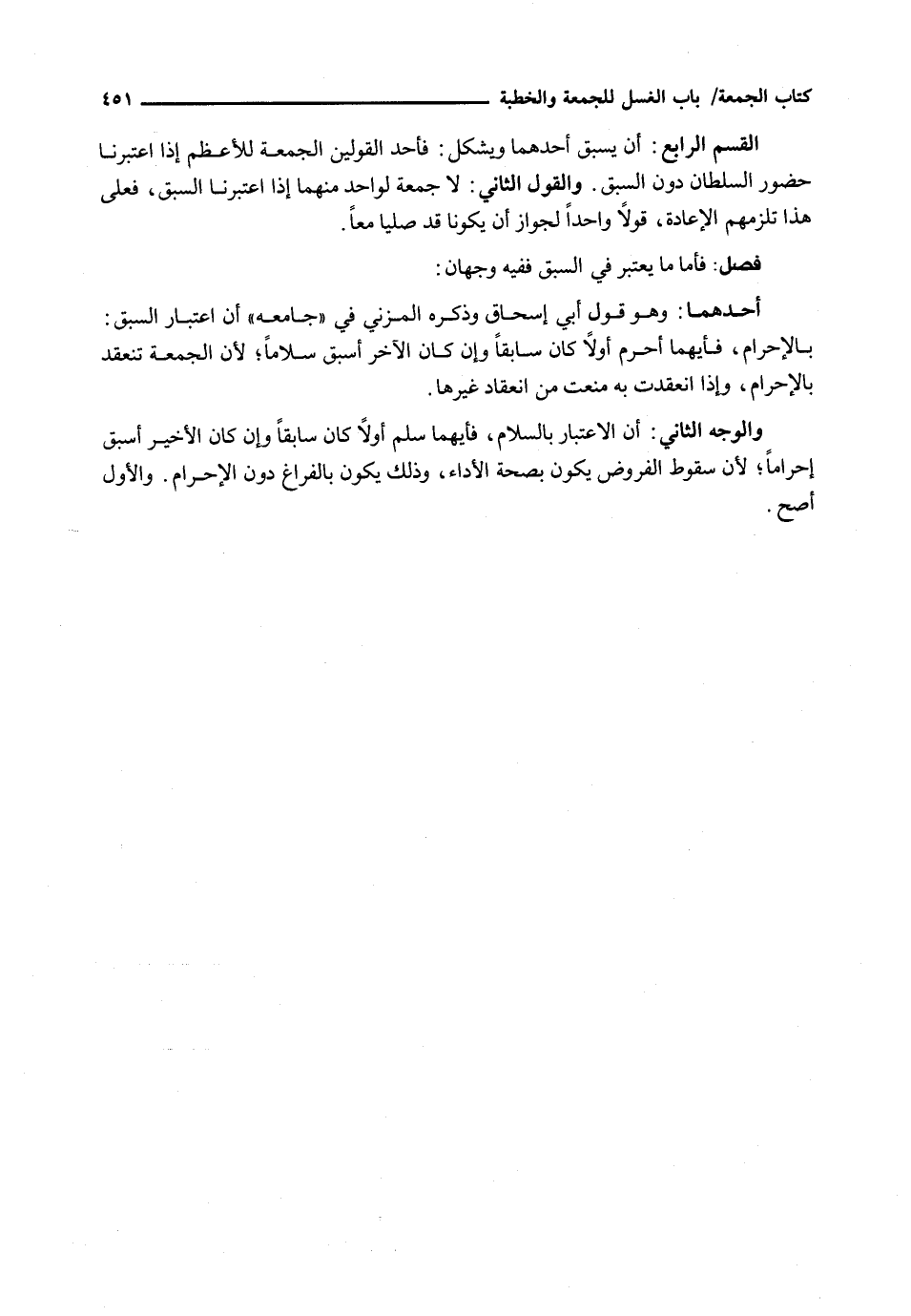 أَحَدُهُمَا: وَهُوَ قَوْلُ أَبِي إِسْحَاقَ وَذَكَرُهُ الْمُزَنِيُّ فِي " جَامِعِهِ " إِنَّ اعْتِبَارَ السَّبْقِ: بِالْإِحْرَامِ، فَأَيُّهُمَا أَحْرَمَ أَوَّلًا كَانَ سَابِقًا وَإِنْ كَانَ الْآخَرُ أَسْبَقَ سَلَامًا، لِأَنَّ الْجُمْعَةَ تَنْعَقِدُ بِالْإِحْرَامِ، وَإِذَا انْعَقَدَتْ بِهِ مَنَعَتْ مِنَ انْعِقَادِ غَيْرِهَا.