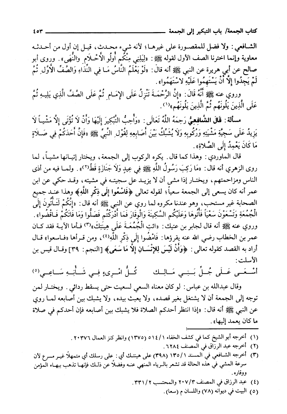 : قال الشافعي رحمه الله تعالى: " وَأُحِبُّ التَّبْكِيرَ إِلَيْهَا وَأَنْ لَا تُؤْتَى إِلَّا مَشْيًا لَا يَزِيدُ عَلَى سَجِيَّةِ مِشْيَتِهِ وَرُكُوبِهِ وَلَا يُشَبِّكُ بَيْنَ أَصَابِعِهِ لِقُوْلِ النَّبِيِّ - صَلَّى اللَّهُ عَلَيْهِ وَسَلَّم َ - " فَإِنَّ أَحَدَكُمْ فِي صَلَاةٍ مَا كَانَ يَعْمِدُ إِلَى الصَّلَاةِ ".