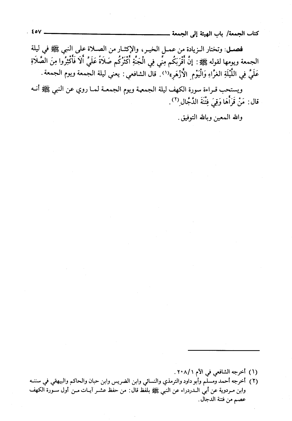 : وَتُخْتَارُ الزِّيَادَةُ مِنْ عَمَلِ الْخَيْرِ، وَالْإِكْثَارِ مِنَ الصَّلَاةِ عَلَى النَّبِيِّ - صَلَّى اللَّهُ عَلَيْهِ وَسَلَّم َ - فِي لَيْلَةِ الْجُمْعَةِ وَيَوْمِهَا لِقَوْلِهِ - صَلَّى اللَّهُ عَلَيْهِ وَسَلَّم َ -: إِنَّ أَقْرَبَكُمْ مِنِّي فِي الْجَنَّةِ أَكْثَرُكُمْ صَلَاةً عَلَيَّ أَلَا فَأَكْثِرُوا مِنَ الصَّلَاةِ عَلَيَّ فِي اللَّيْلَةِ الْغَرَّاءِ وَالْيَوْمِ الْأَزْهَرِ ". قَالَ الشَّافِعِيُّ: يَعْنِي لَيْلَةَ الْجُمْعَةِ وَيَوْمَ الْجُمْعَةِ.