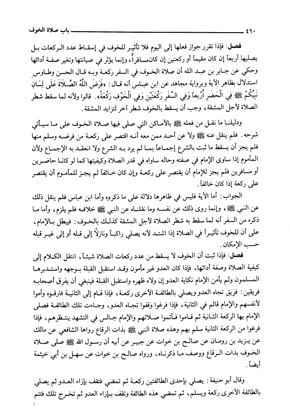 : فَإِذَا ثَبَتَ أَنَّ الْخَوْفَ لَا يُسْقِطُ مِنْ عَدَدِ رَكَعَاتِ الصَّلَاةِ شَيْئًا، انْتَقَلَ الْكَلَامُ إِلَى كَيْفِيَّةِ الصَّلَاةِ وَصِفَةِ أَدَائِهَا، فَإِذَا كَانَ الْعَدُوُّ غَيْرَ مَأْمُونٍ وَقَدِ اسْتَقْبَلَ الْقِبْلَةَ بِوَجْهِهِ وَاسْتَدْبَرَهَا الْمُسْلِمُونَ وَلَمْ يَأْمَنِ الْإِمَامُ نِكَايَةَ الْعَدُوِّ إِنْ وَلَّاهُ ظَهْرَهُ وَاسْتَقْبَلَ الْقِبْلَةَ فَيَنْبَغِي أَنْ يُفَرِّقَ أَصْحَابَهُ فَرِيقَيْنِ: فَرِيقٌ تُجَاهَ الْعَدُوِّ وَيُصَلِّي بِالطَّائِفَةِ الْأُخْرَى رَكْعَةً، فَإِذَا قَامَ إِلَى الثَّانِيَةِ فَارَقُوهُ وَأَمُّوا لِأَنْفُسِهِمْ وَالْإِمَامُ قَائِمٌ فِي الثَّانِيَةِ، فَإِذَا فَرَغُوا وَقَفُوا تُجَاهَ الْعَدُوِّ، وَجَاءَتْ تِلْكَ الطَّائِفَةُ فَصَلَّى الْإِمَامُ بِهَا الرَّكْعَةَ الثَّانِيَةَ ثُمَّ قَامُوا فَأَتَمُّوا صَلَاتَهُمْ وَالْإِمَامُ جَالِسٌ فِي التَّشَهُّدِ يَنْتَظِرُهُمْ، فَإِذَا فَرَغُوا مِنَ الرَّكْعَةِ الثَّانِيَةِ سَلَّمَ بِهِمْ وَهَذِهِ صلاة النبي - صَلَّى اللَّهُ عَلَيْهِ وَسَلَّم َ - بِذَاتِ الرِّقَاعِ رَوَاهَا الشَّافِعِيُّ عَنْ مَالِكٍ عَنْ يَزِيدَ بْنِ رُومَانَ عَنْ صَالِحِ بْنِ خَوَّاتٍ عَنْ جُبَيْرٍ عَنْ أَبِيهِ أَنَّ رَسُولَ اللَّهِ - صَلَّى اللَّهُ عَلَيْهِ وَسَلَّم َ - صَلَّى صَلَاةَ الْخَوْفِ بِذَاتِ الرِّقَاعِ وَوَصَفَ مَا ذَكَرْنَاهُ، وَرَوَاهُ صَالِحُ بْنُ خَوَّاتٍ عَنْ سَهْلِ بن أبي خيثمة أَيْضًا.