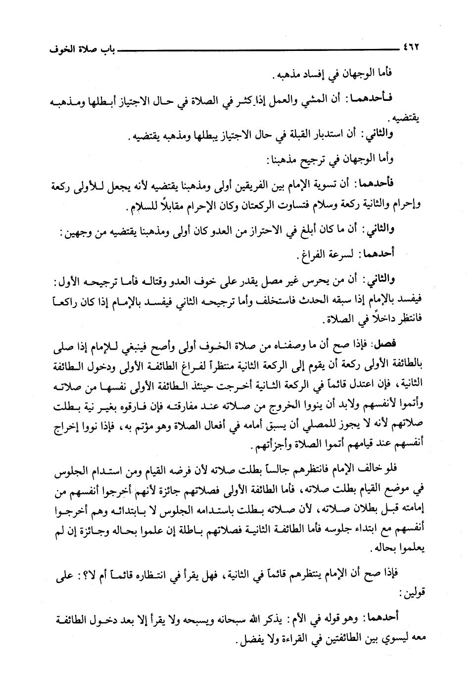 : فَإِذَا صَحَّ أَنَّ مَا وَصَفْنَاهُ مِنْ صَلَاةِ الْخَوْفِ أَوْلَى وَأَصَحُّ فَيَنْبَغِي لِلْإِمَامِ إِذَا صَلَّى بِالطَّائِفَةِ الْأُولَى رَكْعَةً أَنْ يَقُومَ إِلَى الرَّكْعَةِ الثَّانِيَةِ مُنْتَظِرًا لِفَرَاغِ الطَّائِفَةِ الْأُولَى وَدُخُولِ الطَّائِفَةِ الثَّانِيَةِ، فَإِنِ اعْتَدَلَ قَائِمًا فِي الرَّكْعَةِ الثَّانِيَةِ أَخْرَجَتْ حِينَئِذٍ الطَّائِفَةُ الْأُولَى نَفْسَهَا مِنْ صَلَاتِهِ وَأَتَمُّوا لِأَنْفُسِهِمْ وَلَا بُدَّ أَنْ يَنْوُوا الْخُرُوجَ مِنْ صَلَاتِهِ عِنْدَ مُفَارَقَتِهِ فَإِنْ فَارَقُوهُ بغير نية بطلت صلاته لِأَنَّهُ لَا يَجُوزُ لِلْمُصَلِّي أَنْ يَسْبِقَ إِمَامَهُ فِي أَفْعَالِ الصَّلَاةِ وَهُوَ مُؤْتَمٌّ بِهِ، فَإِذَا نَوَوْا إِخْرَاجَ أَنْفُسِهِمْ عِنْدَ قِيَامِهِمْ أَتَمُّوا الصَّلَاةَ وَأَجْزَأَتْهُمْ.