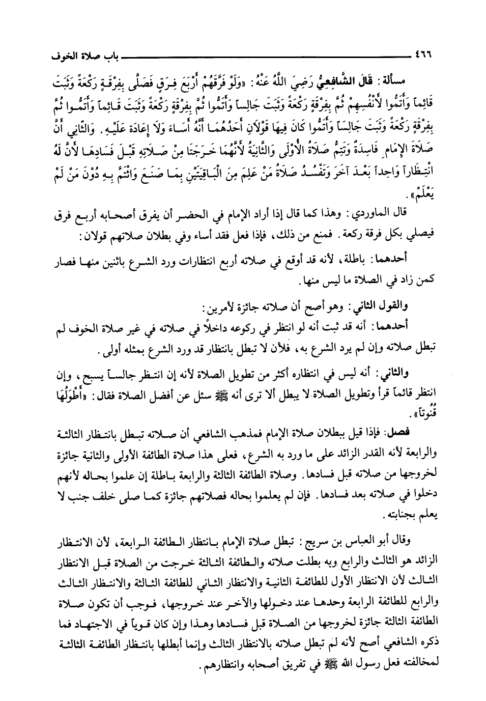 : قال الشافعي رضي الله عنه: " وَلَوْ فَرَّقَهُمْ أَرْبَعَ فِرَقٍ فَصَلَّى بِفِرْقَةٍ رَكْعَةً وَثَبَتَ قَائِمًا وَأَتَمُّوا لِأَنْفُسِهِمْ ثُمَّ بِفِرْقَةٍ رَكْعَةً وَثَبَتَ جَالِسًا وَأَتَمُّوا ثُمَّ بِفِرْقَةٍ رَكْعَةً وَثَبَتَ قَائِمًا وَأَتَمُّوا ثُمَّ بِفِرْقَةٍ رَكْعَةً وَثَبَتَ جَالِسَا وأتموا كان فيها قولان أحدهما أنه أساء ولا إعادة عليه. والثاني أن صلاة الإمام فاسدة وتتم صلاة الأولى والثانية لأنهما خرجتا من صلاته قبل فسادها لأن له انتظارا واحدا بعد آخر وتفسد صلاة من علم ما الباقيتين بما صنع وائتم به دون من لم يعلم ".