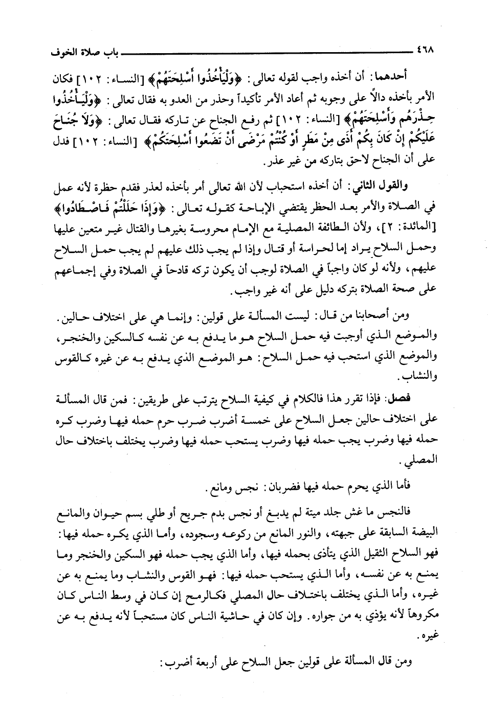 : فَإِذَا تَقَرَّرَ هَذَا فَالْكَلَامُ فِي كيفية السلاح يترتب على طريقين: فَمَنْ قَالَ الْمَسْأَلَةُ عَلَى اخْتِلَافِ حَالَيْنِ جَعَلَ السِّلَاحَ عَلَى خَمْسَةِ أَضْرُبٍ ضَرْبٌ حَرُمَ حَمْلُهُ فِيهَا وَضَرْبٌ كُرِهَ حَمْلُهُ فِيهَا وَضَرْبٌ يَجِبُ حمله فيها وضرب يستحب فِيهَا وَضَرْبٌ يَخْتَلِفُ بِاخْتِلَافِ حَالِ الْمُصَلِّي.