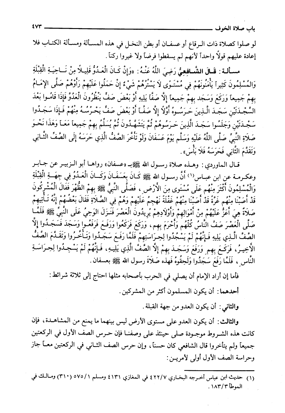 : قال الشافعي رضي الله عنه: " وَإِنْ كَانَ الْعَدُوُّ قَلِيلًا مِنْ نَاحِيَةِ الْقِبْلَةِ والمسلمون كثيرا يأمنونهم في مستوى لَا يَسْتُرُهُمْ شَيْءٌ إِنْ حَمَلُوا عَلَيْهِمْ رَأَوْهُمْ صلى الإمام بهم جميعا وركع وسجد بهم جميعا إلا صفا يليه أو بعض صف ينظرون العدو فإذا قاموا بعد السجدتين سجد الذين حرسوه أولا إلا صفا أو بعض صف يحرسه منهم فإذا سجدوا سجدتين وجلسوا سجد الذين حرسوهم ثم يتشهدون ثم يسلم بهم جميعا معا وهذا نحو صلاة النبي - صَلَّى اللَّهُ عَلَيْهِ وَسَلَّم َ - يوم عسفان ولو تأخر الصف الذي حرسه إلى الصف الثاني وتقدم الثاني فحرسه فلا بأس ".