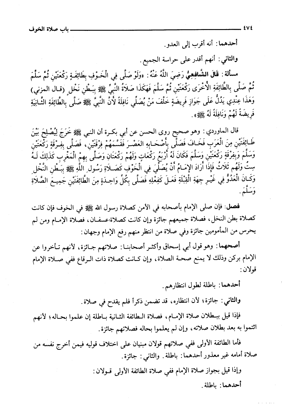 قَالَ الْمَاوَرْدِيُّ: وَهُوَ صَحِيحٌ رَوَى الْحَسَنُ عَنْ أَبِي بَكْرَةَ أَنَّ النَّبِيَّ - صَلَّى اللَّهُ عَلَيْهِ وَسَلَّم َ - خَرَجَ لِيُصْلِحَ بَيْنَ طَائِفَتَيْنِ مِنَ الْعَرَبِ فَخَافَ فَصَلَّى بِأَصْحَابِهِ الْعَصْرَ فَقَسَمَهُمْ فِرْقَتَيْنِ، فَصَلَّى بِفِرْقَةٍ رَكْعَتَيْنِ وَسَلَّمَ وَبِفِرْقَةٍ رَكْعَتَيْنِ وَسَلَّمَ فَكَانَ لَهُ أَرْبَعُ رَكَعَاتٍ وَلَهُمْ رَكْعَتَانِ وَصَلَّى بِهِمُ الْمَغْرِبَ كَذَلِكَ لَهُ سِتٌّ وَلَهُمْ ثَلَاثٌ فَإِذَا أَرَادَ الْإِمَامُ أَنْ يُصَلِّيَ فِي الْخَوْفِ كَصَلَاةِ رَسُولِ الله - صَلَّى اللَّهُ عَلَيْهِ وَسَلَّم َ - بِبَطْنِ النَّخْلِ وَكَانَ الْعَدُوُّ فِي غَيْرِ جِهَةِ الْقِبْلَةِ فَعَلَ كَفِعْلِهِ فَصَلَّى بِكُلِّ وَاحِدَةٍ مِنَ الطَّائِفَتَيْنِ جَمِيعَ الصَّلَاةِ وَسَلَّمَ.