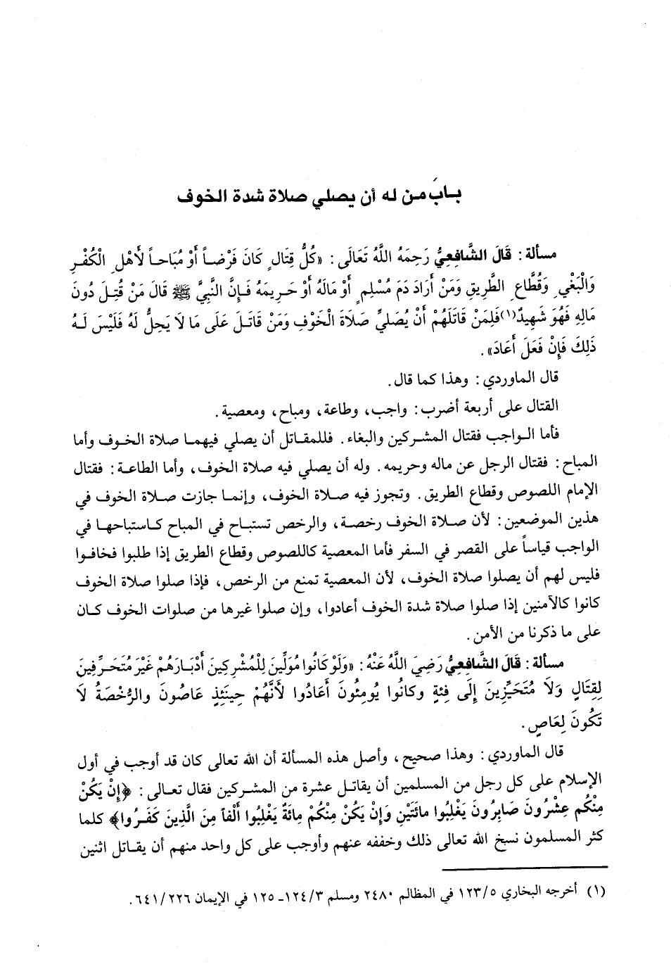 : قال الشافعي رضي الله عنه: " وَلَيْسَ لِأَحَدٍ أَنْ يُصَلِّيَ صَلَاةَ الْخَوْفِ فِي طَلَبِ الْعَدُوِّ لِأَنَّهُ أَمِنَ وَطَلَبُهُمُ تَطَوُّعٌ وَالصَّلَاةُ فَرْضٌ وَلَا يُصَلِّيهَا كَذَلِكَ إِلَّا خَائِفًا ".