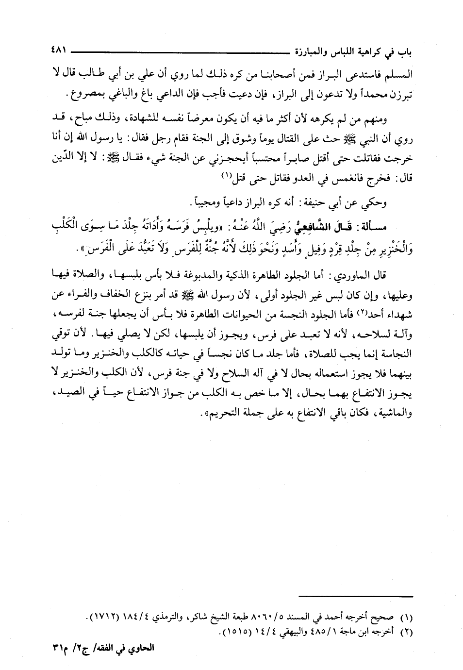 قَالَ الْمَاوَرْدِيُّ: أَمَّا الْجُلُودُ الطَّاهِرَةُ الذَّكِيَّةُ وَالْمَدْبُوغَةُ فَلَا بَأْسَ بِلُبْسِهَا، وَالصَّلَاةِ فِيهَا وَعَلَيْهَا، وَإِنْ كَانَ لُبْسُ غَيْرِ الْجُلُودِ أَوْلَى، لِأَنَّ رَسُولَ اللَّهِ - صَلَّى اللَّهُ عَلَيْهِ وَسَلَّم َ - قَدْ أَمَرَ بِنَزْعِ الْخِفَافِ وَالْفِرَاءِ عَنْ شُهَدَاءِ أُحُدٍ فَأَمَّا الْجُلُودُ النَّجِسَةُ مِنَ الْحَيَوَانَاتِ الطَّاهِرَةِ فَلَا بَأْسَ أَنْ يَجْعَلَهَا جُنَّةً لِفَرَسِهِ، وَآلَةً لِسِلَاحِهِ، لِأَنَّهُ لَا تَعَبُّدَ عَلَى فَرَسٍ، وَيَجُوزُ أَنْ يَلْبَسَهَا، لَكِنْ لَا يُصَلِّي فِيهَا. لِأَنَّ تَوَقِّيَ النَّجَاسَةِ إِنَّمَا يَجِبُ لِلصَّلَاةِ، فَأَمَّا جِلْدُ مَا كَانَ نَجِسًا فِي حَيَاتِهِ كَالْكَلْبِ وَالْخِنْزِيرِ وَمَا تَوَلَّدَ بَيْنَهُمَا فَلَا يَجُوزُ اسْتِعْمَالُهُ بِحَالٍ لَا فِي آلَةِ السِّلَاحِ وَلَا فِي جُنَّةِ فَرَسٍ، لِأَنَّ الْكَلْبَ وَالْخِنْزِيرَ لَا يَجُوزُ الِانْتِفَاعُ بِهِمَا بِحَالٍ، إِلَّا مَا خُصَّ بِهِ الْكَلْبُ مِنْ جَوَازِ الِانْتِفَاعِ حَيًّا فِي الصَّيْدِ، وَالْمَاشِيَةِ، فَكَانَ بَاقِي الِانْتِفَاعِ بِهِ عَلَى جُمْلَةِ التَّحْرِيمِ ".