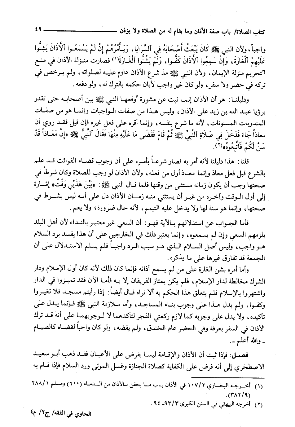 وَاجِبًا، وَلِأَنَّ النَّبِيَّ - صَلَّى اللَّهُ عَلَيْهِ وَسَلَّم َ - كَانَ يَبْعَثُ أَصْحَابَهُ فِي السَّرَايَا، وَيَأْمُرُهُمْ إِنْ لَمْ يَسْمَعُوا الْأَذَانَ يَشُنُّوا عَلَيْهِمُ الْغَارَةَ، وَإِنْ سَمِعُوا الْأَذَانَ كَفُّوا، وَلَمْ يَشُنُّوا الْغَارَةَ فَصَارَتْ مَنْزِلَةُ الْأَذَانِ فِي مَنْعِ التَّحْرِيمِ مَنْزِلَةَ الْإِيمَانِ، ولأن النبي - صَلَّى اللَّهُ عَلَيْهِ وَسَلَّم َ - مُذْ شَرَعَ الْأَذَانَ دَاوَمَ عَلَيْهِ لِصَلَوَاتِهِ، وَلَمْ يُرَخِّصْ فِي تَرْكِهِ فِي حَضَرٍ وَلَا سَفَرٍ، وَلَوْ كَانَ غَيْرَ وَاجِبٍ لَأَبَانَ حُكْمَهُ بِالتَّرْكِ لَهُ، وَلَوْ دَفَعَهُ.