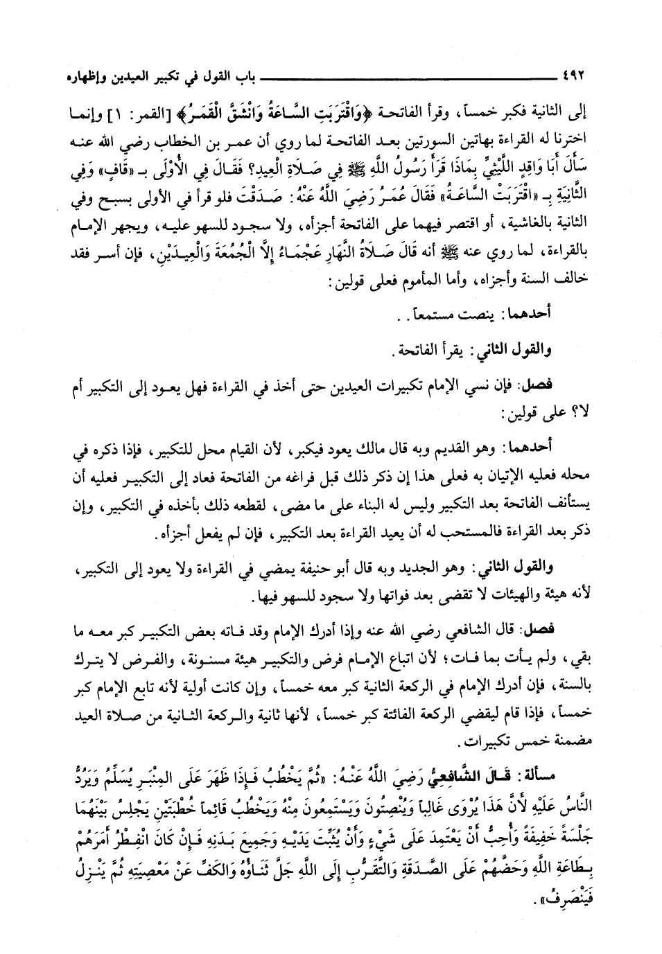 إلى الثانية فكبر خمسا، وقرأ الفاتحة {واقتربت السَّاعَةُ وَانْشَقَّ الْقَمَرُ} [القمر: 1] وَإِنَّمَا اخْتَرْنَا لَهُ الْقِرَاءَةَ بِهَاتَيْنِ السُّورَتَيْنِ بَعْدَ الْفَاتِحَةِ لِمَا رُوِيَ أَنَّ عُمَرَ بْنَ الْخَطَّابِ رَضِيَ اللَّهُ عَنْهُ سَأَلَ أَبَا وَاقِدٍ اللَّيْثِيَّ بِمَاذَا قَرَأَ رَسُولُ اللَّهِ - صَلَّى اللَّهُ عَلَيْهِ وَسَلَّم َ - فِي صَلَاةِ الْعِيدِ؟ فَقَالَ فِي الْأُولَى بِ {قاف} وفي الثانية ب {اقتربت الساعة} فَقَالَ عُمَرُ رَضِيَ اللَّهُ عَنْهُ: صَدَقْتَ فَلَوْ قرأ في الأولى بسبح وفي الثانية بالغاشية، أَوِ اقْتَصَرَ فِيهِمَا عَلَى الْفَاتِحَةِ أَجْزَأَهُ، وَلَا سُجُودَ لِلسَّهْوِ عَلَيْهِ، وَيَجْهَرُ الْإِمَامُ بِالْقِرَاءَةِ، لِمَا روي عنه - صَلَّى اللَّهُ عَلَيْهِ وَسَلَّم َ - أَنَّهُ قَالَ صَلَاةُ النَّهَارِ عَجْمَاءُ إِلَّا الْجُمُعَةَ وَالْعِيدَيْنِ، فَإِنْ أَسَرَّ فَقَدْ خَالَفَ السُّنَّةَ وَأَجْزَاهُ، وَأَمَّا الْمَأْمُومُ فَعَلَى قَوْلَيْنِ: