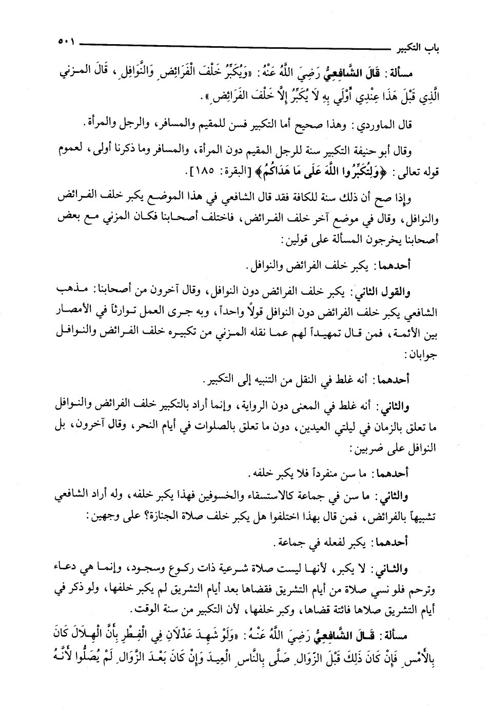 : قال الشافعي رضي الله عنه: " ويكبر خلف الفرائض والنوافل، قال المزني الذي قبل هذا عندي أَوْلَى بِهِ لَا يُكَبِّرُ إِلَّا خَلْفَ الْفَرَائِضِ ".