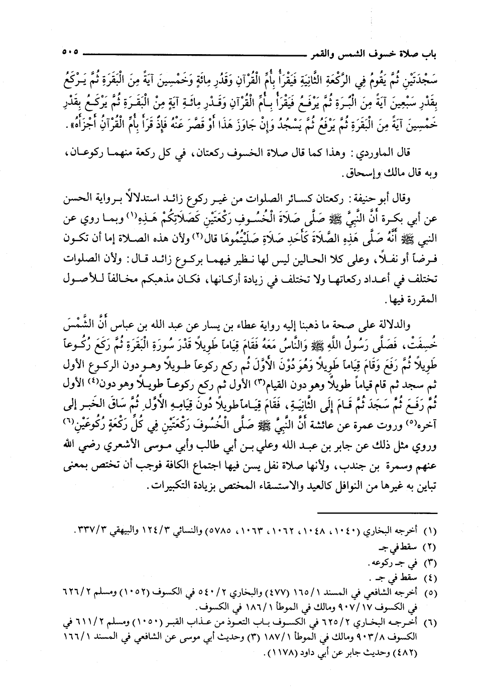 وَقَالَ أبو حنيفة: رَكْعَتَانِ كَسَائِرِ الصَّلَوَاتِ مِنْ غير ركوع زائد استدلالا براوية الحسن عن أَبِي بَكْرَةَ أَنَّ النَّبِيَّ - صَلَّى اللَّهُ عَلَيْهِ وَسَلَّم َ - صَلَّى صَلَاةَ الْخُسُوفِ رَكْعَتَيْنِ كَصَلَاتِكُمْ هَذِهِ وَبِمَا رُوِيَ عَنِ النَّبِيِّ - صَلَّى اللَّهُ عَلَيْهِ وَسَلَّم َ - أَنَّهُ صَلَّى هَذِهِ الصَّلَاةَ كَأَحَدِ صَلَاةٍ صَلَّيْتُمُوهَا قَالَ وَلِأَنَّ هَذِهِ الصَّلَاةَ إِمَّا أَنْ تَكُونَ فَرْضًا أَوْ نَفْلًا، وَعَلَى كِلَا الْحَالَيْنِ لَيْسَ لَهَا نَظِيرٌ فِيهِمَا بِرُكُوعٍ زَائِدٍ قَالَ: وَلِأَنَّ الصَّلَوَاتِ تَخْتَلِفُ فِي أَعْدَادِ رَكَعَاتِهَا وَلَا تَخْتَلِفُ فِي زِيَادَةِ أَرْكَانِهَا، فَكَانَ مَذْهَبُكُمْ مُخَالِفًا لِلْأُصُولِ الْمُقَرَّرَةِ فِيهَا.