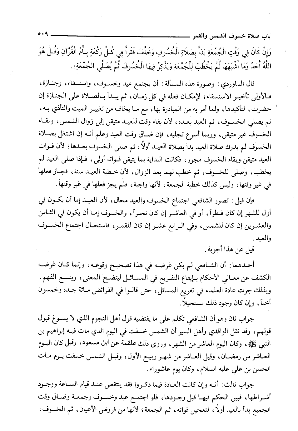 فَإِنْ قِيلَ: تَصَوُّرُ الشَّافِعِيِّ اجْتِمَاعَ الْخُسُوفِ وَالْعِيدِ مُحَالٌ، لِأَنَّ الْعِيدَ إِمَّا أَنْ يكون في أول للشهر إِنْ كَانَ فِطْرًا، أَوْ فِي الْعَاشِرِ إِنْ كَانَ نَحْرًا، وَالْخُسُوفَ إِمَّا أَنْ يَكُونَ فِي الثَّامِنِ وَالْعِشْرِينَ إِنْ كَانَ لِلشَّمْسِ، وَفِي الرَّابِعَ عَشَرَ إِنْ كَانَ لِلْقَمَرِ، فَاسْتَحَالَ اجْتِمَاعُ الْخُسُوفِ والعيد.
