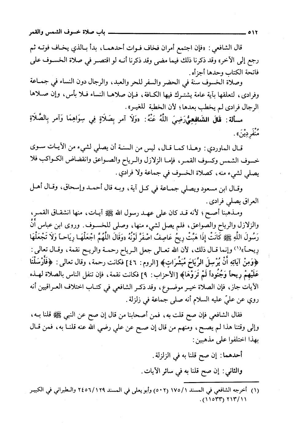 قَالَ الْمَاوَرْدِيُّ: وَهَذَا كَمَا قَالَ، لَيْسَ مِنَ السُّنَّةِ أَنْ يُصَلِّيَ لِشَيْءٍ مِنَ الْآيَاتِ سِوَى خُسُوفِ الشَّمْسِ وَكُسُوفِ الْقَمَرِ، فَأَمَّا الزِّلَازِلُ وَالرِّيَاحُ وَالصَّوَاعِقُ وَانْقِضَاضُ الْكَوَاكِبِ فَلَا يُصَلَّى لِشَيْءٍ مِنْهُ، كَصَلَاةِ الْخُسُوفِ في جماعة لا فُرَادَى.