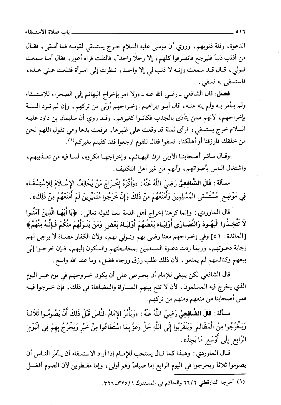 : قَالَ الشَّافِعِيُّ - رَضِيَ اللَّهُ عَنْهُ - " وَلَا آمُرُ بِإِخْرَاجِ الْبَهَائِمِ إِلَى الصَّحْرَاءِ لِلِاسْتِسْقَاءِ وَلَمْ يَأْمُرْ بِهِ وَلَمْ يَنْهَ عَنْهُ، قَالَ أَبُو إِبْرَاهِيمَ: إِخْرَاجُهُمْ أَوْلَى مِنْ تَرْكِهِمْ، وَإِنْ لَمْ تَرِدِ السُّنَّةُ بِإِخْرَاجِهِمْ، لِأَنَّهُمْ مِمَّنْ يَتَأَذَّى بِالْجَدْبِ فَكَانُوا كَغَيْرِهِمْ، وَقَدْ رُوِيَ أَنَّ سُلَيْمَانَ بْنَ دَاوُدَ عَلَيْهِ السَّلَامُ خَرَجَ يَسْتَسْقِي، فَرَأَى نَمْلَةً قد وقعت على ظهرها، فرفعت يدها وهو تَقُولُ اللَّهُمَّ نَحْنُ مِنْ خَلْقِكَ فَارْزُقْنَا أَوْ أهلكنا، فسقوا فقال للقوم ارْجِعُوا فَقَدْ كُفِيتُمْ بِغَيْرِكُمْ.