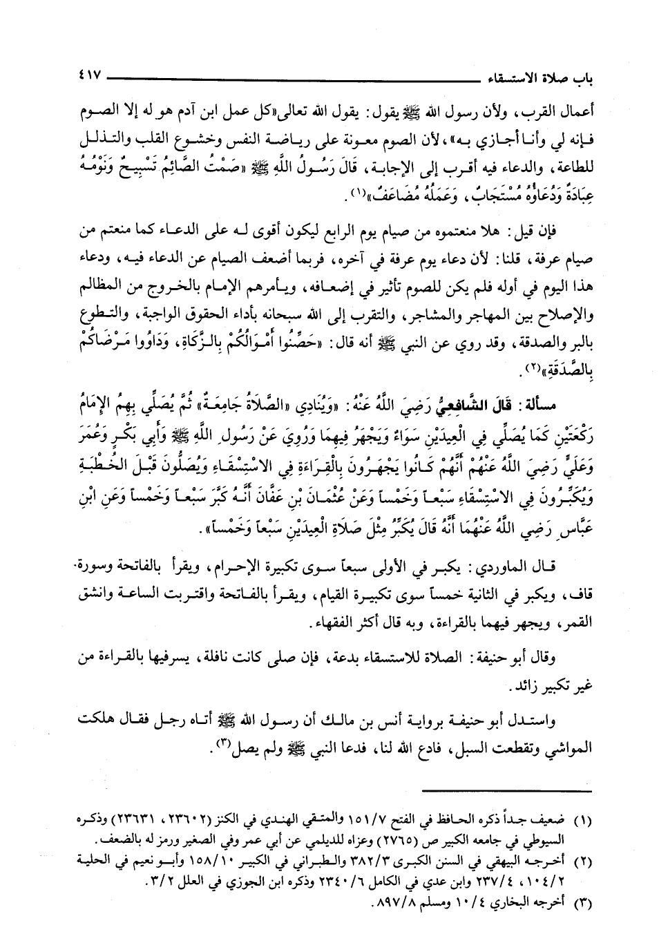 فَإِنْ قِيلَ: هَلَّا مَنَعْتُمُوهُ مِنْ صِيَامِ يَوْمِ الرَّابِعِ لِيَكُونَ أَقْوَى لَهُ عَلَى الدُّعَاءِ كَمَا مَنَعْتُمْ مِنْ صِيَامِ عَرَفَةَ، قُلْنَا: لِأَنَّ دُعَاءَ يَوْمِ عَرَفَةَ فِي آخِرِهِ، فَرُبَّمَا أَضْعَفَ الصِّيَامُ عَنِ الدُّعَاءِ فِيهِ، وَدُعَاءُ هَذَا الْيَوْمِ فِي أَوَّلِهِ فَلَمْ يَكُنْ لِلصَّوْمِ تَأْثِيرٌ فِي إِضْعَافِهِ، وَيَأْمُرُهُمُ الْإِمَامُ بِالْخُرُوجِ مِنَ الْمَظَالِمِ وَالْإِصْلَاحِ بَيْنَ الْمُهَاجِرِ وَالْمُشَاجِرِ، وَالتَّقَرُّبِ إِلَى اللَّهِ سُبْحَانَهُ بِأَدَاءِ الْحُقُوقِ الْوَاجِبَةِ، وَالتَّطَوُّعِ بِالْبِرِّ وَالصَّدَقَةِ، وَقَدْ رُوِيَ عَنِ النَّبِيِّ - صَلَّى اللَّهُ عَلَيْهِ وَسَلَّم َ - أَنَّهُ قَالَ: " حَصِّنُوا أَمْوَالكُمْ بِالزَّكَاةِ، وَدَاوُوا مَرْضَاكُمْ بالصدقة ".