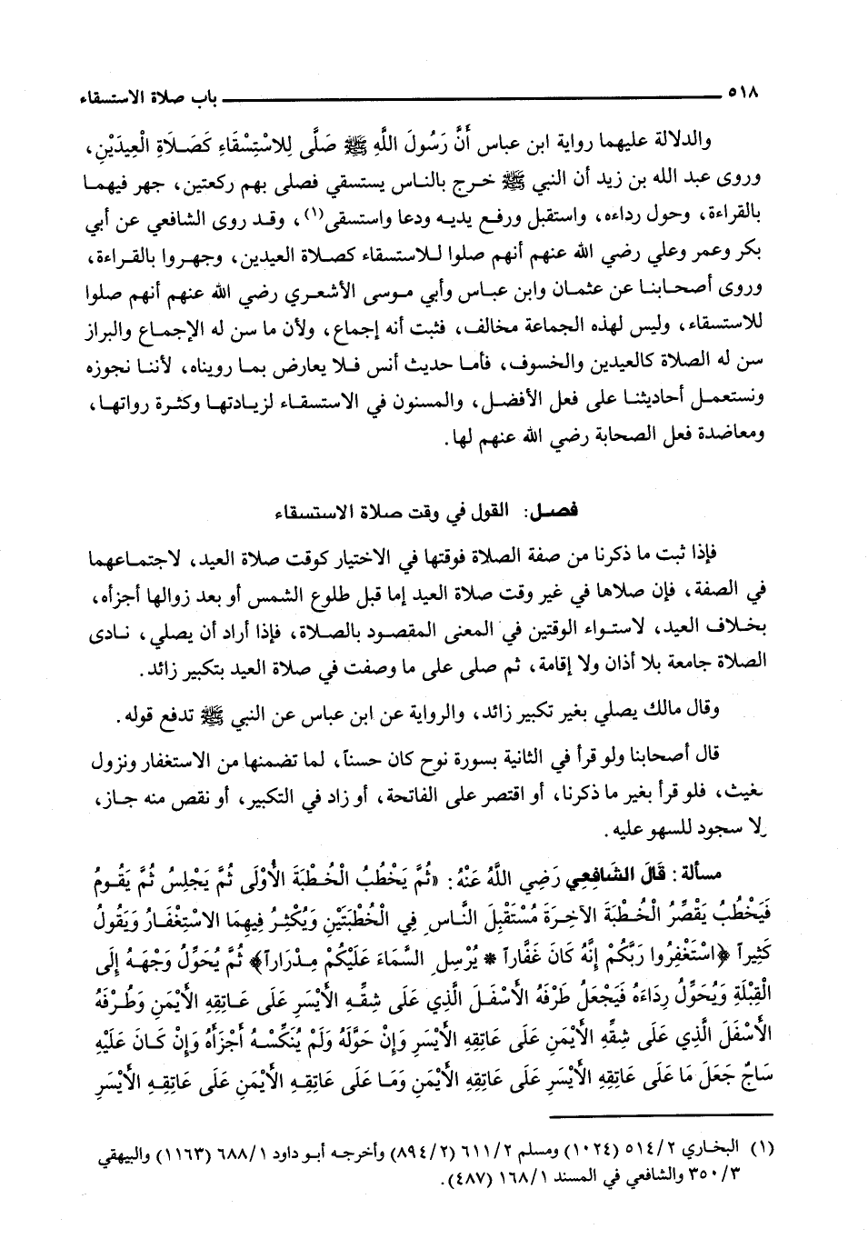 : قال الشافعي رضي الله عنه: " ثم يخطب الْخُطْبَةَ الْأُولَى ثُمَّ يَجْلِسُ ثُمَّ يَقُومُ فَيَخْطُبُ يقصر الخطبة الآخرة مستقبل الناس في الخطبتين ويكثر فيهما الاستغفار ويقول كثيرا {استغفروا ربكم إنه كان غفارا يرسل السماء عليكم مدرارا} ثم يحول وجهه إلى القبلة ويحول رداءه فيجعل طرفه الأسفل الذي على شقه الأيسر على عاتقه الأيمن وطرفه الأسفل الذي على شقه الأيمن على عاتقه الأيسر وإن حوله ولم ينكسه أجزأه وإن كان عليه ساج جعل ما على عاتقه الأيسر على عاتقه الأيمن وما على عاتقه الأيمن على عاتقه الأيسر