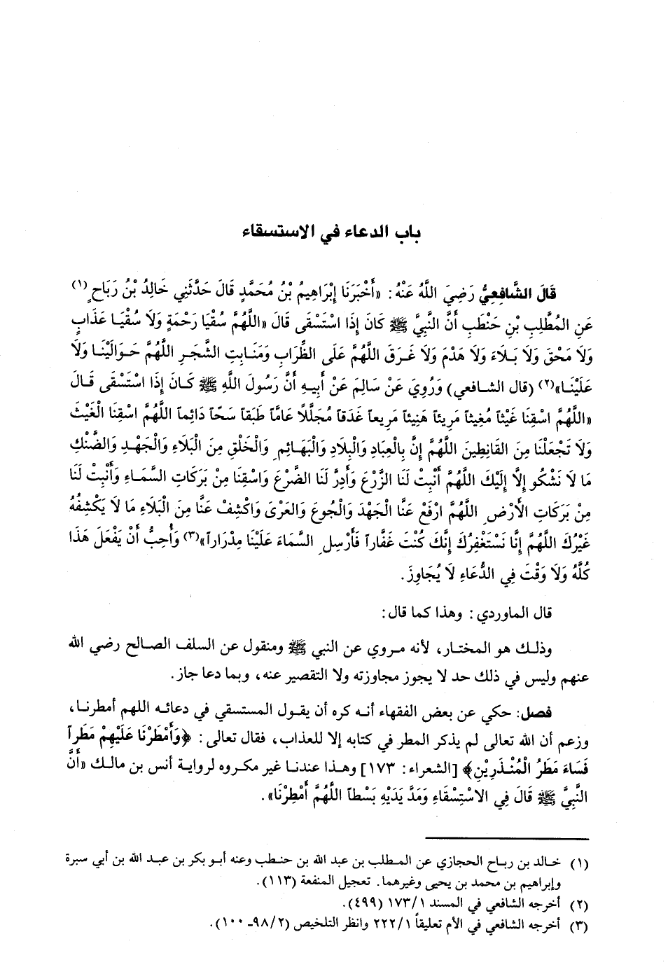 قال الشافعي رضي الله عنه: " أَخْبَرَنَا إِبْرَاهِيمُ بْنُ مُحَمَدٍ قَالَ حَدَّثَنِي خَالِدُ بْنُ رَبَاحٍ عَنِ الْمُطَّلِبِ بْنِ حَنْطَبٍ أَنَّ النبي - صَلَّى اللَّهُ عَلَيْهِ وَسَلَّم َ - كان إذا استسقى قال " اللَّهُمَّ سُقْيَا رَحْمَةٍ وَلَا سُقْيَا عَذَابٍ وَلَا مَحْقَ وَلَا بَلَاءَ وَلَا هَدْمَ وَلَا غَرَقَ اللَّهُمَّ عَلَى الظِّرَابِ وَمَنَابِتِ الشَّجَرِ اللَّهُمَّ حَوَالَيْنَا وَلَا عَلَيْنَا " (قَالَ الشَّافِعِيُّ) وَرُوِيَ عَنْ سَالِمٍ عَنْ أَبِيهِ أَنَّ رَسُولَ اللَّهِ - صَلَّى اللَّهُ عَلَيْهِ وَسَلَّم َ - كَانَ إِذَا اسْتَسْقَى قَالَ " اللَّهُمَّ اسْقِنَا غَيْثًا مُغِيثًا مَرِيئًا هَنِيئًا مَرِيعًا غَدَقًا مُجَلَّلًا عَامَّا طَبَقًا سَحًّا دَائِمًا اللَّهُمَّ اسْقِنَا الْغَيْثَ وَلَا تَجْعَلْنَا مِنَ الْقَانِطِينَ اللَّهُمَّ إِنَّ بِالْعِبَادِ وَالْبِلَادِ وَالْبَهَائِمِ وَالْخَلْقِ مِنَ الْبَلَاءِ وَالْجَهْدِ وَالضَّنْكِ مَا لَا نَشْكُو إِلَّا إِلَيْكَ اللَّهُمَّ أَنْبِتْ لَنَا الزَّرْعَ وَأَدِرَّ لَنَا الضَّرْعَ وَاسْقِنَا مِنْ بَرَكَاتِ السماء وَأَنْبِتْ لَنَا مِنْ بَرَكَاتِ الْأَرْضِ اللَّهُمَّ ارْفَعْ عَنَّا الْجَهْدَ وَالْجُوعَ وَالْعُرْيَ وَاكْشِفْ عَنَّا مِنَ الْبَلَاءِ مَا لَا يَكْشِفُهُ غَيْرُكَ اللَّهُمَّ إِنَا نَسْتَغْفِرُكَ إِنَّكَ كُنْتَ غَفَّارًا فَأَرْسِلِ السَّمَاءَ عَلَيْنَا مِدْرَارًا " وَأُحِبُّ أَنْ يَفْعَلَ هَذَا كُلَّهُ وَلَا وَقْتَ فِي الدُّعَاءِ لَا يُجَاوِزَ.