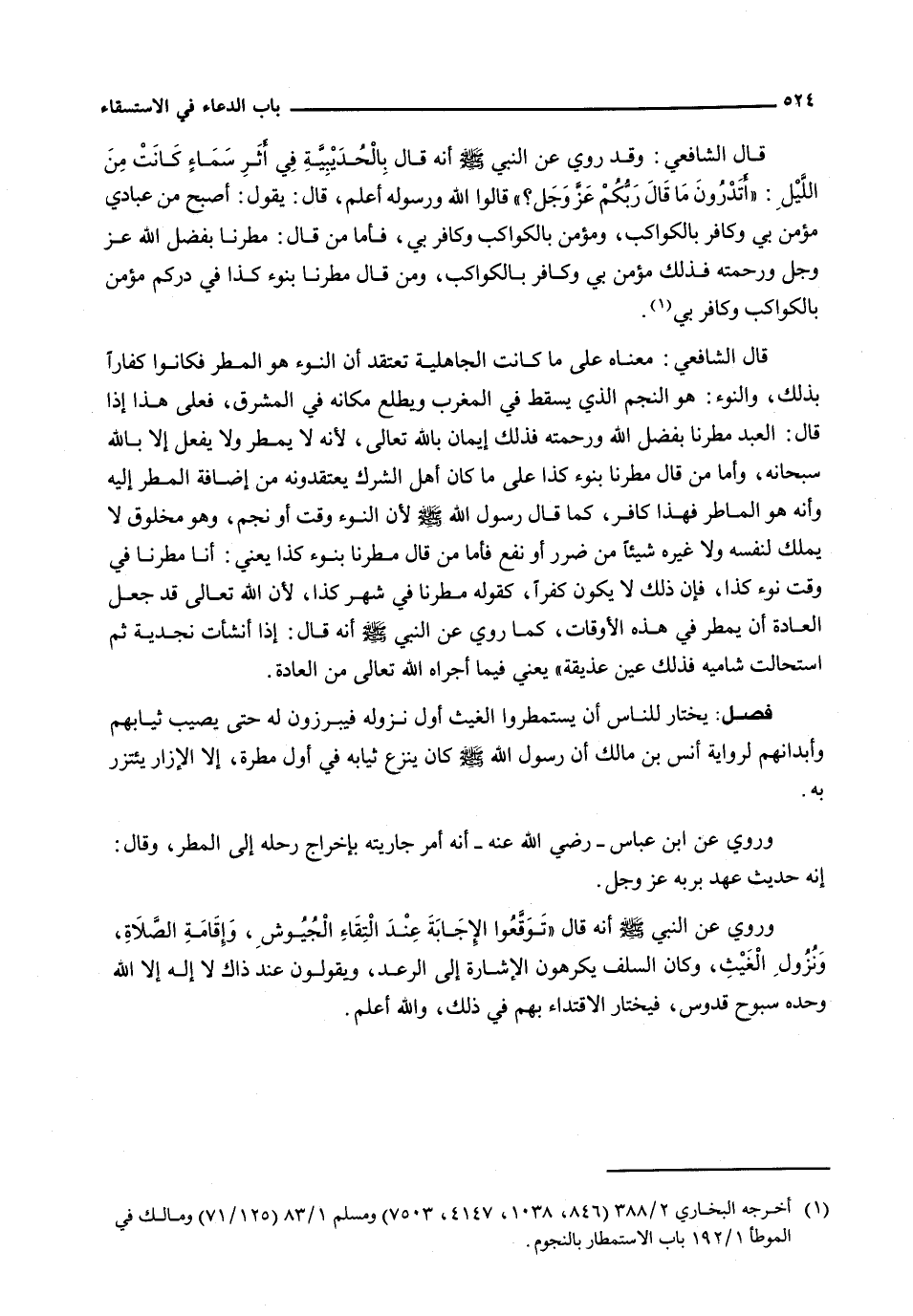 قَالَ الشَّافِعِيُّ: وَقَدْ رُوِيَ عَنِ النَّبِيِّ - صَلَّى اللَّهُ عَلَيْهِ وَسَلَّم َ - أَنَّهُ قَالَ بِالْحُدَيْبِيَةِ فِي أَثَرِ سَمَاءٍ كَانَتْ مِنَ اللَّيْلِ: " أَتَدْرُونَ مَا قَالَ رَبُّكُمْ عَزَّ وجل؟ " قال اللَّهُ وَرَسُولُهُ أَعْلَمُ، قَالَ: يَقُولُ: أَصْبَحَ مِنْ عِبَادِي مُؤْمِنٌ بِي وَكَافِرٌ بِالْكَوَاكِبِ، وَمُؤْمِنٌ بِالْكَوَاكِبِ وَكَافِرٌ بِي، فَأَمَّا مَنْ قَالَ: مُطِرْنَا بِفَضْلِ اللَّهِ عَزَّ وَجَلَّ وَرَحْمَتِهِ فَذَلِكَ مُؤْمِنٌ بِي وَكَافِرٌ بِالْكَوَاكِبِ، وَمَنْ قَالَ مُطِرْنَا بِنَوْءِ كَذَا في دركم مُؤْمِنٌ بِالْكَوَاكِبِ وَكَافِرٌ بِي ".