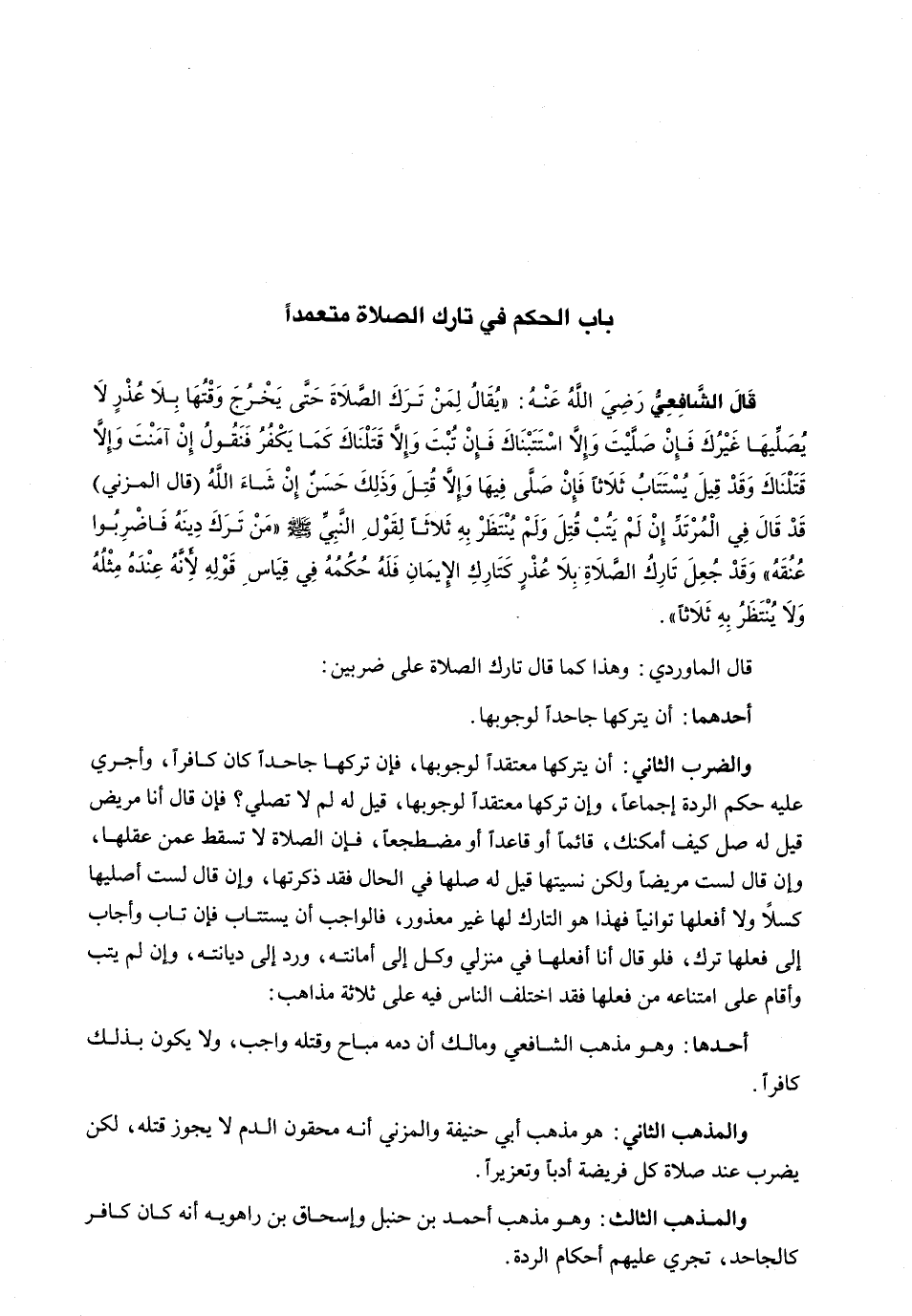 وَالضَّرْبُ الثَّانِي: أَنْ يَتْرُكَهَا مُعْتَقِدًا لِوُجُوبِهَا، فَإِنْ تَرَكَهَا جَاحِدًا كَانَ كَافِرًا، وَأجْرى عَلَيْهِ حُكْم الرِّدَّةِ إِجْمَاعًا، وَإِنْ تَرَكَهَا مُعْتَقِدًا لِوُجُوبِهَا، قِيلَ لَهُ لِمَ لَا تُصَلِّي؟ فَإِنْ قَالَ أَنَا مَرِيضٌ قِيلَ لَهُ صَلِّ كَيْفَ أَمْكَنَكَ، قَائِمًا أَوْ قَاعِدًا أَوْ مُضْطَجِعًا، فَإِنَّ الصَّلَاةَ لَا تَسْقُطُ عَمَّنْ عَقَلَهَا، وَإِنْ قَالَ لَسْتُ مَرِيضًا وَلَكِنْ نَسِيتُهَا قِيلَ لَهُ صَلِّهَا فِي الْحَالِ فَقَدْ ذَكَرْتَهَا، وَإِنْ قَالَ لَسْتُ أُصَلِّيهَا كَسَلًا وَلَا أَفْعَلُهَا تَوَانِيًا فَهَذَا هُوَ التَّارِكُ لَهَا غَيْرُ مَعْذُورٍ، فَالْوَاجِبُ أَنْ يُسْتَتَابَ فَإِنْ تَابَ وَأَجَابَ إِلَى فِعْلِهَا تُرِكَ، فَلَوْ قَالَ أَنَا أَفْعَلُهَا فِي مَنْزِلِي وُكِّلَ إِلَى أَمَانَتِهِ، وَرُدَّ إِلَى دِيَانَتِهِ، وَإِنْ لَمْ يَتُبْ وَأَقَامَ عَلَى امْتِنَاعِهِ مِنْ فِعْلِهَا فَقَدِ اخْتَلَفَ النَّاسُ فِيهِ عَلَى ثَلَاثَةِ مَذَاهِبَ: