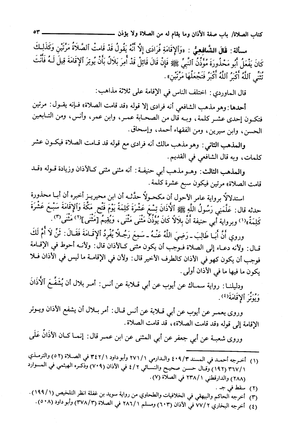 : قَالَ الشَّافِعِيُّ: " وَالْإِقَامَةِ فُرَادَى إِلَّا أَنَّهُ يَقُولُ قد قامت الصلاة مرتين وكذلك كان يفعل أبو محذورة مؤذن النبي - صَلَّى اللَّهُ عَلَيْهِ وَسَلَّم َ - فإن قال قائل قد أمر بلال بأن يوتر الإقامة قيل له فأنت تثني الله أكبر الله أكبر فتجعلها مَرَّتَيْنِ ".