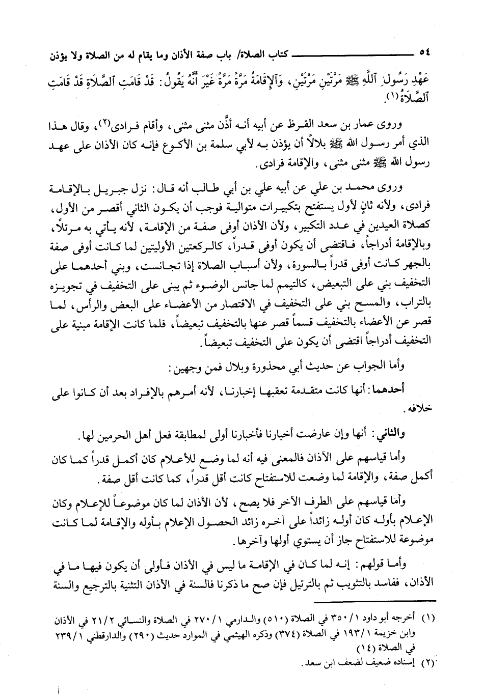 وَأَمَّا قِيَاسُهُمْ عَلَى الْأَذَانِ فَالْمَعْنَى فِيهِ أَنَّهُ لَمَّا وُضِعَ لِلْإِعْلَامِ كَانَ أَكْمَلَ قَدْرًا كَمَا كَانَ أَكْمَلَ صِفَةً، وَالْإِقَامَةُ لَمَّا وُضِعَتْ لِلِاسْتِفْتَاحِ كَانَتْ أَقَلَّ قَدْرًا، كَمَا كَانَتْ أَقَلَّ صِفَةً.