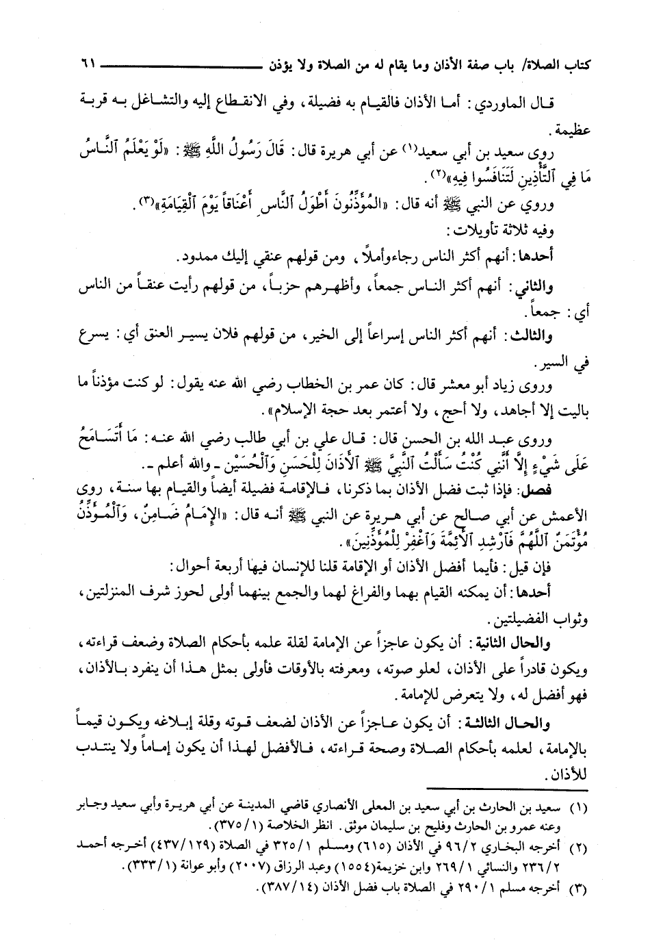 قَالَ الْمَاوَرْدِيُّ: أَمَّا الْأَذَانُ فَالْقِيَامُ بِهِ فَضِيلَةٌ، وَفِي الِانْقِطَاعِ إِلَيْهِ وَالتَّشَاغُلِ بِهِ قُرْبَةٌ عَظِيمَةٌ.