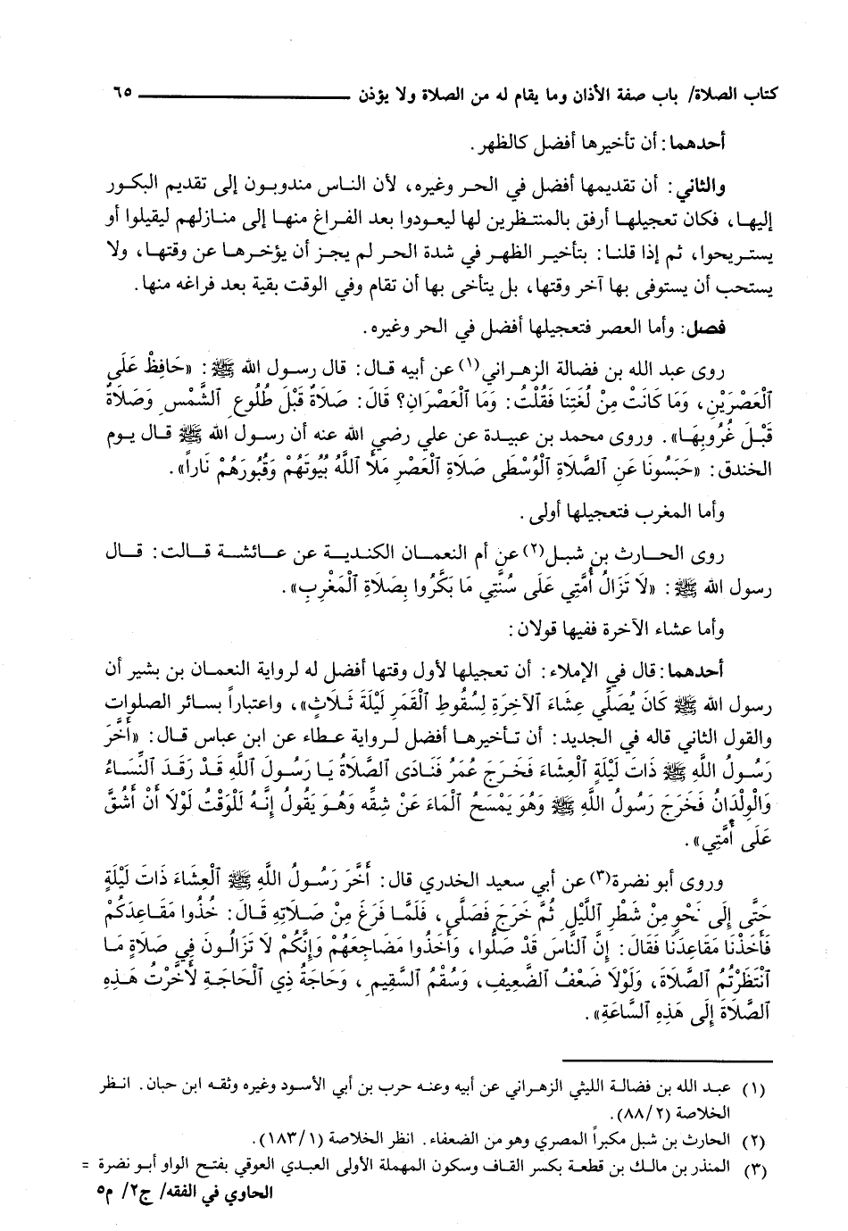 رَوَى عَبْدُ اللَّهِ بْنُ فَضَالَةَ الزَّهْرَانِيُّ عَنْ أَبِيهِ قَالَ: قَالَ رَسُولُ اللَّهِ - صَلَّى اللَّهُ عَلَيْهِ وَسَلَّم َ -: " حَافِظْ عَلَى الْعَصْرَيْنِ، وَمَا كَانَتْ مِنْ لُغَتِنَا فَقُلْتُ: وَمَا الْعَصْرَانِ؟ قَالَ: صَلَاةٌ قَبْلَ طُلُوعِ الشَّمْسِ وَصَلَاةٌ قَبْلَ غُرُوبِهَا ". وَرَوَى مُحَمَّدُ بْنُ عُبَيْدَةَ عَنْ عَلِيٍّ رَضِيَ اللَّهُ عَنْهُ أَنَّ رَسُولَ اللَّهِ - صَلَّى اللَّهُ عَلَيْهِ وَسَلَّم َ - قَالَ يَوْمَ الْخَنْدَقِ: " حَبَسُونَا عَنِ الصَّلَاةِ الْوُسْطَى صَلَاةِ الْعَصْرِ مَلَأَ اللَّهُ بُيُوتَهُمْ وَقُبُورَهُمْ نَارًا "