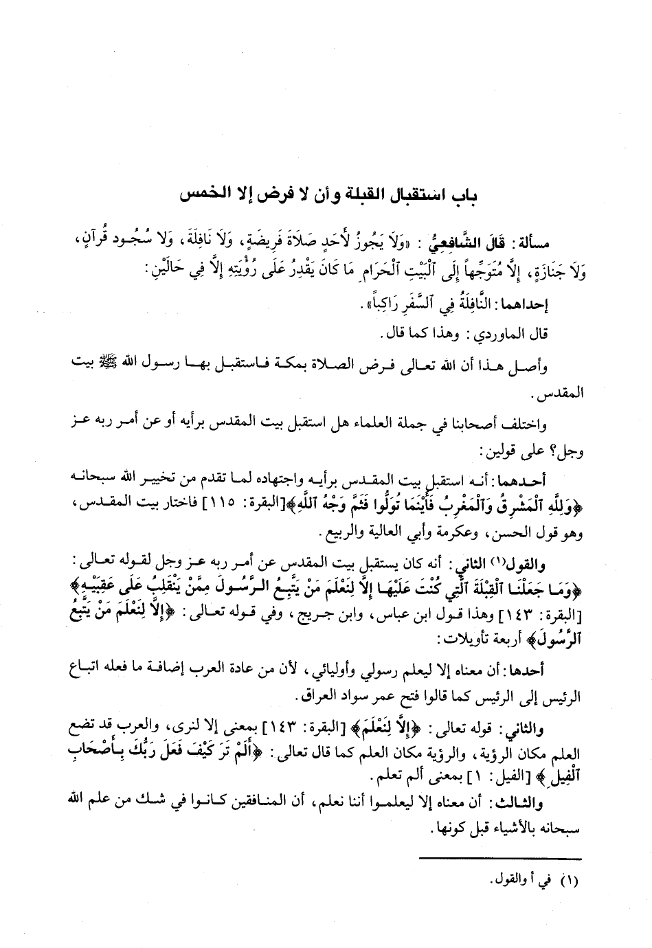 : قَالَ الشَّافِعِيُّ: (وَلَا يَجُوزُ لَأَحَدٍ صَلَاةُ فَرِيضَةٍ، وَلَا نَافِلَةٍ، وَلَا سُجُودُ قُرْآنٍ، وَلَا جِنَازَةٍ، إِلَّا مُتَوَجِّهًا إِلَى الْبَيْتِ الْحَرَامِ مَا كَانَ يَقْدِرُ عَلَى رُؤْيَتِهِ إِلَّا فِي حَالَيْنِ: