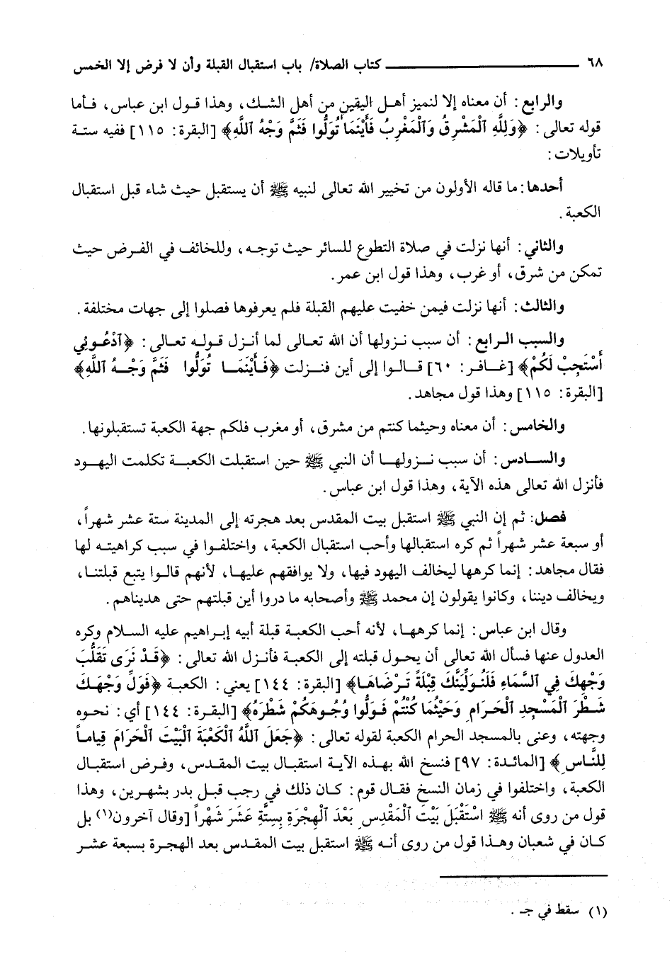 وَقَالَ ابْنُ عَبَّاسٍ: إِنَّمَا كَرِهَهَا، لِأَنَّهُ أَحَبَّ الْكَعْبَةَ قِبْلَةَ أَبِيهِ إِبْرَاهِيمَ عَلَيْهِ السَّلَامُ وَكَرِهَ الْعُدُولَ عَنْهَا فَسَأَلَ اللَّهَ تَعَالَى أَنْ يُحَوِّلَ قِبْلَتَهُ إِلَى الْكَعْبَةِ فَأَنْزَلَ اللَّهُ تَعَالَى: {قَدْ نَرَى تَقَلُّبَ وَجْهِكَ فِي السَّمَاءِ فَلَنُوَلِّيَنَّكَ قِبْلَةً تَرْضَاهَا} [البقرة: 144] يَعْنِي: الْكَعْبَةَ {فَوَلِّ وَجْهَكَ شَطْرَ المسجد الحرام وحيثما كُنْتُمْ فَوَلُّوا وُجُوهَكُمْ شَطْرَهُ} [البقرة: 144] أَيْ: نَحْوَهُ وَجِهَتَهُ، وَعَنَى بِالْمَسْجِدِ الْحَرَامِ الْكَعْبَةَ لِقَوْلِهِ تَعَالَى: {جَعَلَ اللَّهُ الْكَعْبَةَ الْبَيْتَ الْحَرَامَ قِيَامًا لِلنَّاسِ} [المائدة: 97] فَنَسَخَ اللَّهُ بِهَذِهِ الْآيَةِ اسْتِقْبَالَ بَيْتِ الْمَقْدِسِ، وَفَرَضَ اسْتِقْبَالَ الْكَعْبَةِ، وَاخْتَلَفُوا فِي زَمَانِ النَّسْخِ فَقَالَ قَوْمٌ: كَانَ ذَلِكَ فِي رَجَبٍ قَبْلَ بَدْرٍ بِشَهْرَيْنِ، وَهَذَا قَوْلُ مَنْ رَوَى أنه - صَلَّى اللَّهُ عَلَيْهِ وَسَلَّم َ - اسْتَقْبَلَ بَيْتَ الْمَقْدِسِ بَعْدَ الْهِجْرَةِ بِسِتَّةَ عَشَرَ شَهْرًا [وَقَالَ آخَرُونَ بَلْ كَانَ فِي شَعْبَانَ وَهَذَا قَوْلُ مَنْ رَوَى أَنَّهُ - صَلَّى اللَّهُ عَلَيْهِ وَسَلَّم َ - اسْتَقْبَلَ بَيْتَ الْمَقْدِسِ بَعْدَ الْهِجْرَةِ بِسَبْعَةَ عَشَرَ