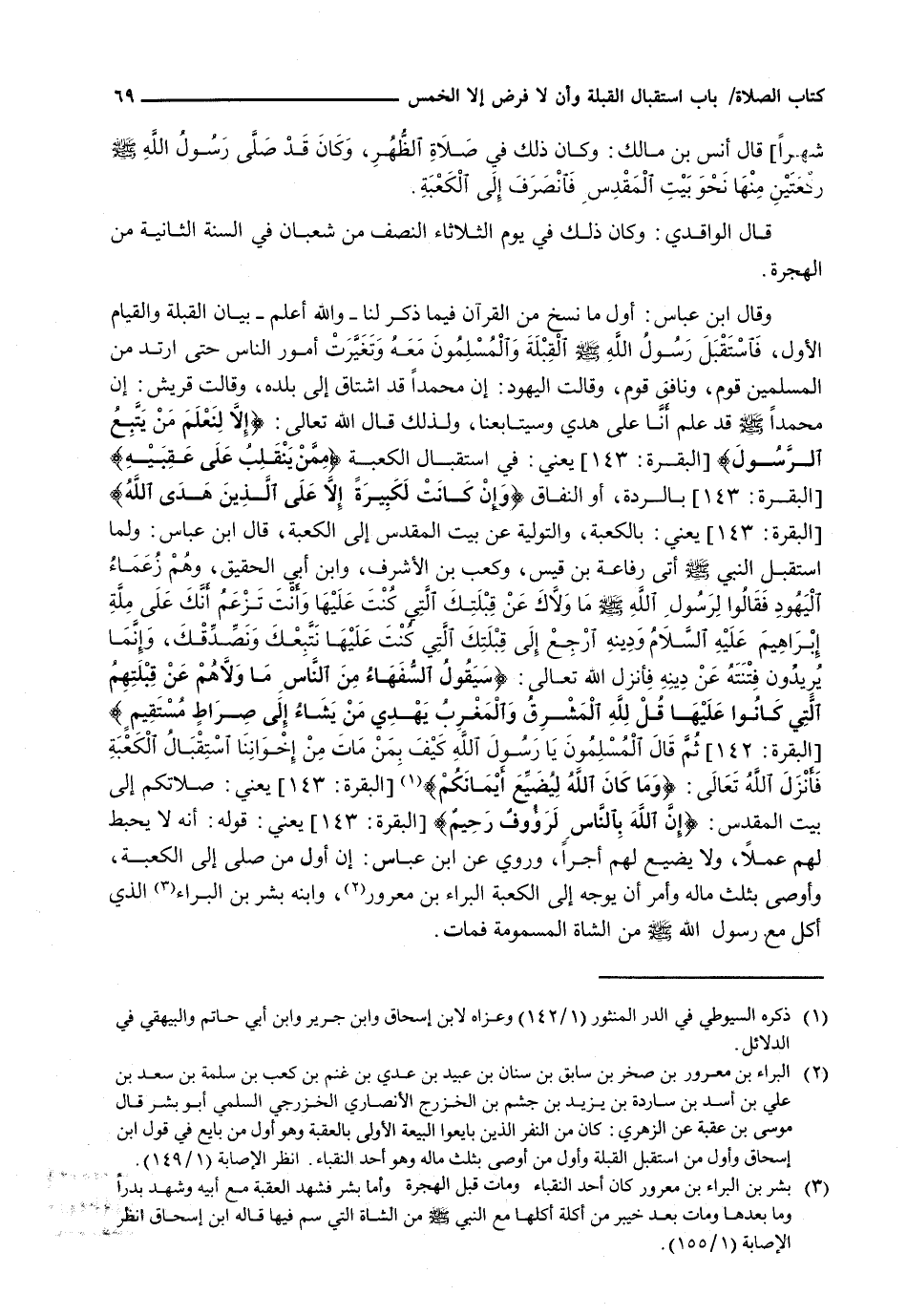 وقال ابْنُ عَبَّاسٍ: أَوَّلُ مَا نُسِخَ مِنَ الْقُرْآنِ فِيمَا ذُكِرَ لَنَا - وَاللَّهُ أَعْلَمُ - بَيَانُ الْقِبْلَةِ وَالْقِيَامُ الْأَوَّلُ، فَاسْتَقْبَلَ رَسُولُ اللَّهِ - صَلَّى اللَّهُ عَلَيْهِ وَسَلَّم َ - الْقِبْلَةَ وَالْمُسْلِمُونَ مَعَهُ وَتَغَيَّرَتْ أُمُورُ النَّاسِ حَتَّى ارْتَدَّ مِنَ الْمُسْلِمِينَ قَوْمٌ، وَنَافَقَ قَوْمٌ، وَقَالَتِ الْيَهُودُ: إِنَّ مُحَمَّدًا قَدِ اشْتَاقَ إِلَى بَلَدِهِ، وَقَالَتْ قُرَيْشٌ: إِنَّ مُحَمَّدًا - صَلَّى اللَّهُ عَلَيْهِ وَسَلَّم َ - قَدْ عَلِمَ أَنَّا عَلَى هُدًى وَسَيُتَابِعُنَا، وَلِذَلِكَ قَالَ اللَّهُ تَعَالَى: {إِلا لِنَعْلَمَ مَنْ يَتَّبِعُ الرَّسُولَ} [البقرة: 143] يَعْنِي: فِي اسْتِقْبَالِ الْكَعْبَةِ {مِمَّنْ ينقلب على عقبيه} [البقرة: 143] بِالرِّدَّةِ، أَوِ النِّفَاقِ {وَإِنْ كَانَتْ لَكَبِيرَةً إِلا عَلَى الَّذِينَ هَدَى اللَّهُ} [البقرة: 143] يَعْنِي: بِالْكَعْبَةِ، وَالتَّوْلِيَةِ عَنْ بَيْتِ الْمَقْدِسِ إِلَى الْكَعْبَةِ، قَالَ ابْنُ عَبَّاسٍ: وَلَمَّا اسْتَقْبَلَ النَّبِيُّ - صَلَّى اللَّهُ عَلَيْهِ وَسَلَّم َ - أَتَى رَفَاعَةُ بْنُ قَيْسٍ، وَكَعْبُ بْنُ الْأَشْرَفِ، وَابْنُ أَبِي الْحَقِيقِ، وَهُمْ زُعَمَاءُ الْيَهُودِ فَقَالُوا لرسول الله - صَلَّى اللَّهُ عَلَيْهِ وَسَلَّم َ - مَا وَلَّاكَ عَنْ قِبْلَتِكَ الَّتِي كُنْتَ عَلَيْهَا وَأَنْتَ تَزْعُمُ أَنَّكَ عَلَى مِلَّةِ إِبْرَاهِيمَ عَلَيْهِ السَّلَامُ وَدِينِهِ ارْجِعْ إِلَى قِبْلَتِكَ الَّتِي كُنْتَ عَلَيْهَا نَتَّبِعْكَ وَنُصَدِّقْكَ، وَإِنَّمَا يُرِيدُونَ فِتْنَتَهُ عَنْ دِينِهِ فَأَنْزَلَ اللَّهُ تَعَالَى: {سَيَقُولُ السُّفَهَاءُ مِنَ النَّاسِ مَا وَلاهُمْ عَنْ قِبْلَتِهِمُ الَّتِي كَانُوا عَلَيْهَا قُلْ لِلَّهِ الْمَشْرِقُ وَالْمَغْرِبُ يَهْدِي مَنْ يَشَاءُ إِلَى صِرَاطٍ مُسْتَقِيمٍ} [البقرة: 142] ثُمَّ قَالَ الْمُسْلِمُونَ يَا رَسُولَ اللَّهِ كَيْفَ بِمَنْ مَاتَ مِنْ إِخْوَانِنَا اسْتِقْبَالُ الْكَعْبَةِ فَأَنْزَلَ اللَّهُ تَعَالَى: {وَمَا كَانَ اللَّهُ لِيُضِيعَ إِيمَانَكُمْ) {1) [البقرة: 143] يَعْنِي: صَلَاتَكُمْ إِلَى بَيْتِ الْمَقْدِسِ: {إِنَّ اللَّهَ بِالنَّاسِ لرؤوف رَحِيمٌ} [البقرة: 143] يَعْنِي: قَوْلَهُ: أَنَّهُ لَا يُحْبِطُ لَهُمْ عَمَلًا، وَلَا يُضِيعُ لَهُمْ أَجْرًا، وَرُوِيَ عَنِ ابْنِ عَبَّاسٍ: إِنَّ أَوَّلَ مَنْ صَلَّى إِلَى الْكَعْبَةِ، وَأَوْصَى بِثُلْثِ مَالِهِ وَأَمَرَ أَنْ يُوَجِّهَ إِلَى الْكَعْبَةِ الْبَرَاءُ بْنُ مَعْرُورٍ، وَابْنُهُ بِشْرُ بْنُ الْبَرَاءِ الَّذِي أَكَلَ مَعَ رَسُولِ اللَّهِ - صَلَّى اللَّهُ عَلَيْهِ وَسَلَّم َ - مِنَ الشَّاةِ الْمَسْمُومَةِ فَمَاتَ