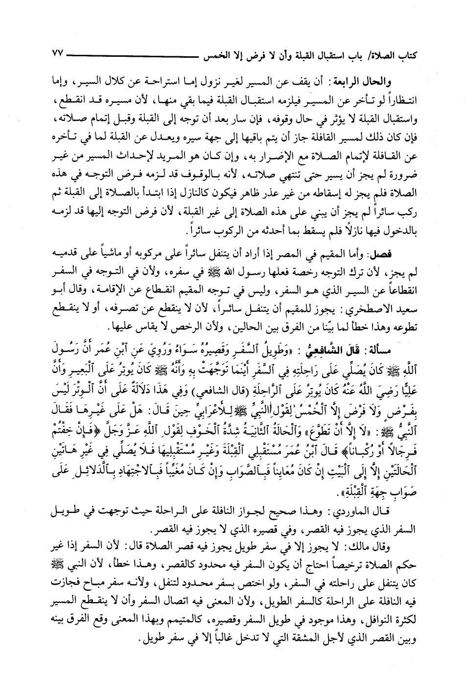 : قال الشافعي: " وطويل السفر وقصيره سواء وَرُوِيَ عَنِ ابْنِ عُمَرَ أَنَّ رَسُولَ اللَّهِ - صَلَّى اللَّهُ عَلَيْهِ وَسَلَّم َ - كان يصلي على راحلته في السفر أينما توجهت به وأنه - صَلَّى اللَّهُ عَلَيْهِ وَسَلَّم َ - كان يوتر على البعير وأن علياًّ رضي الله عنه كان يوتر على الراحلة (قال الشافعي) وفي هذا دلالة على أن الوتر ليس بفرض ولا فرض إلا الخمس لقول النبي - صَلَّى اللَّهُ عَلَيْهِ وَسَلَّم َ - للأعرابي حين قال: هل على غيرها فقال النبي - صَلَّى اللَّهُ عَلَيْهِ وَسَلَّم َ -: (لا إلا أن تطوع) والحالة الثانية شدة الخوف لقول الله عز وجل {فإن خفتم فرجالاً أو ركباناً} قَالَ ابْنُ عُمَرَ مُسْتَقْبِلِي الْقِبْلَةِ وَغَيْرَ مُسْتَقْبِلِيهَا فلا يصلي في غير هاتين الحالتين إلا إلى البيت إن كان معايناً فبالصواب وإن كان مغيباً فبالاجتهاد بالدلائل على صواب جهة القبلة "