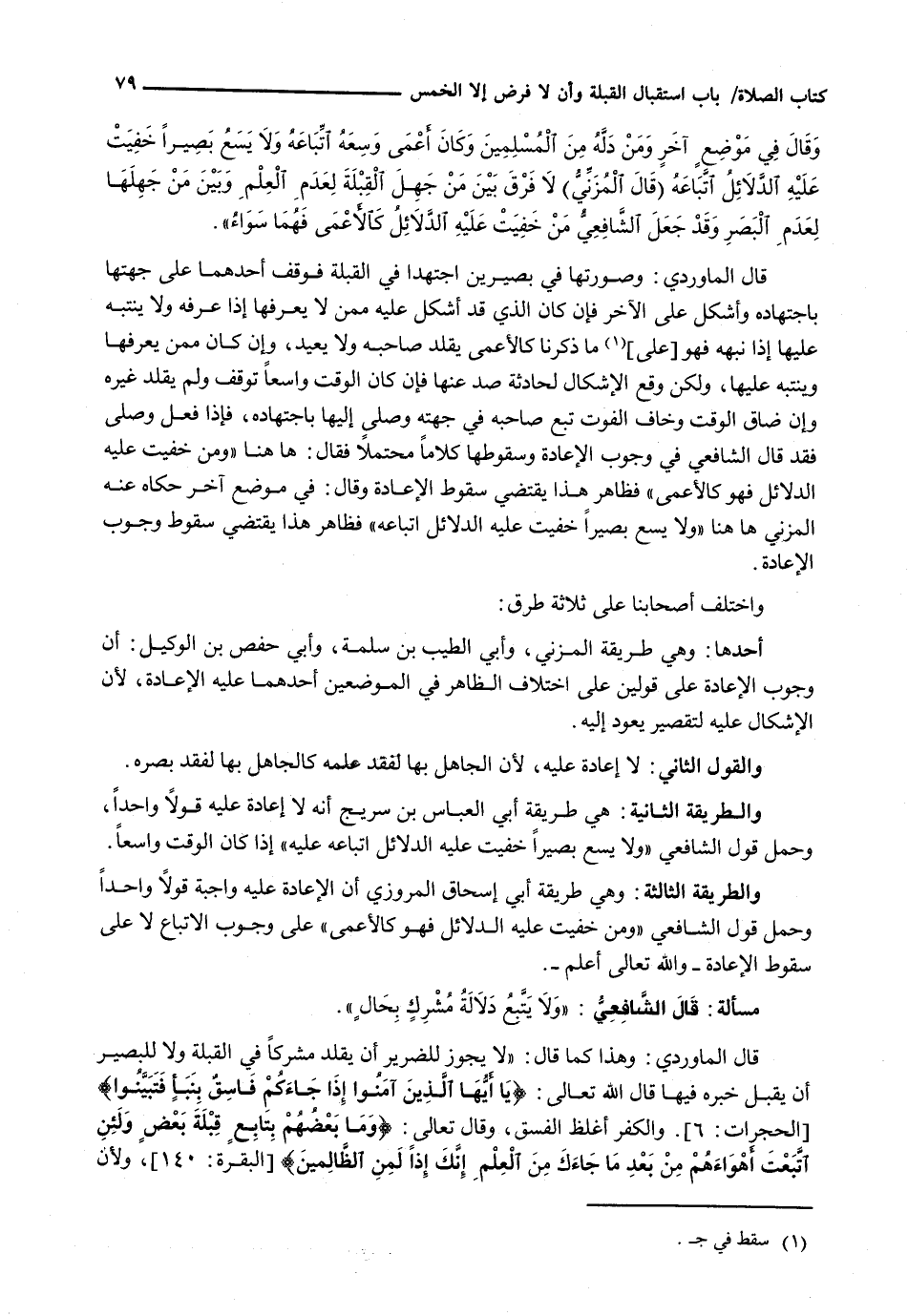 وَقَالَ فِي مَوْضِعٍ آخَرَ وَمَنْ دَلَّهُ مِنَ الْمُسْلِمِينَ وَكَانَ أَعْمَى وَسِعَهُ اتِّبَاعُهُ وَلَا يَسَعُ بَصِيرًا خَفِيَتْ عَلَيْهِ الدَّلَائِلُ اتَّبَاعُهُ (قَالَ الْمُزَنِيُّ) لَا فَرْقَ بَيْنَ مَنْ جَهِلَ الْقِبْلَةَ لِعَدَمِ العلم وبين من جهلها لعدم البصر وقد جعل الشافعي من خفيت عليه الدلائل كالأعمى فهما سواء