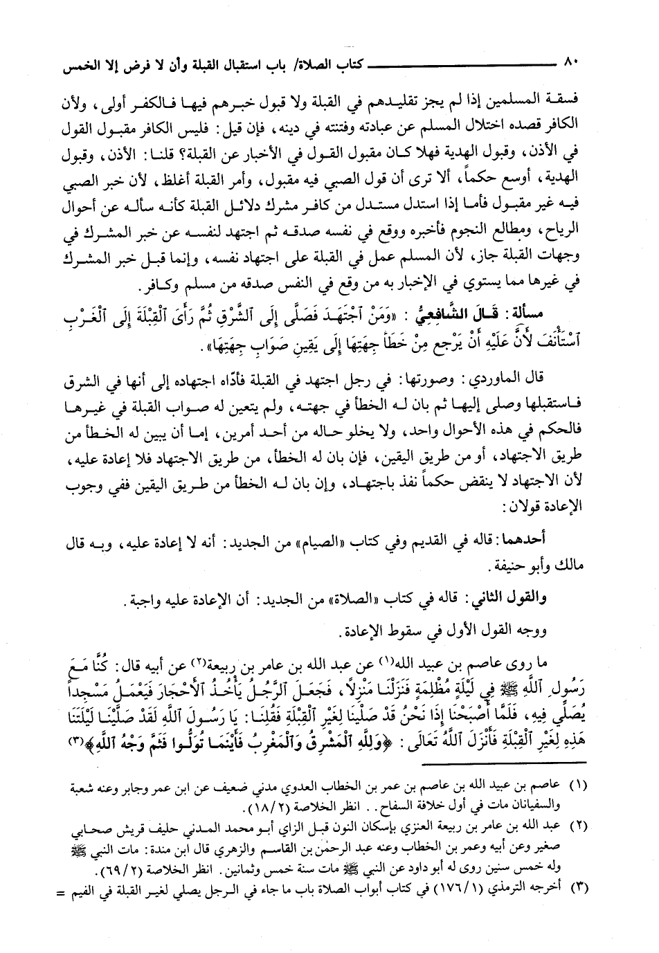 مَا رَوَى عَاصِمُ بْنُ عُبَيْدِ اللَّهِ عَنْ عَبْدِ اللَّهِ بْنِ عَامِرِ بْنِ رَبِيعَةَ عَنْ أَبِيهِ قَالَ: كُنَّا مَعَ رَسُولِ اللَّهِ - صَلَّى اللَّهُ عَلَيْهِ وَسَلَّم َ - فِي لَيْلَةٍ مُظْلِمَةٍ فَنَزَلْنَا مَنْزِلًا، فَجَعَلَ الرَّجُلُ يَأْخُذُ الْأَحْجَارَ فَيَعْمَلُ مَسْجِدًا يُصَلِّي فِيهِ، فَلَمْا أَصْبَحْنَا إِذَا نَحْنُ قَدْ صَلَّيْنَا لِغَيْرِ الْقِبْلَةِ فَقُلْنَا: يَا رَسُولَ اللَّهِ لَقَدْ صَلَّيْنَا لَيْلَتَنَا هَذِهِ لِغَيْرِ الْقِبْلَةِ فَأَنْزَلَ اللَّهُ تَعَالَى: {وَلِلَّهِ الْمَشْرِقُ وَالْمَغْرِبُ فَأَيْنَمَا تُوَلُّوا فَثَمَّ وَجْهُ اللَّهِ}