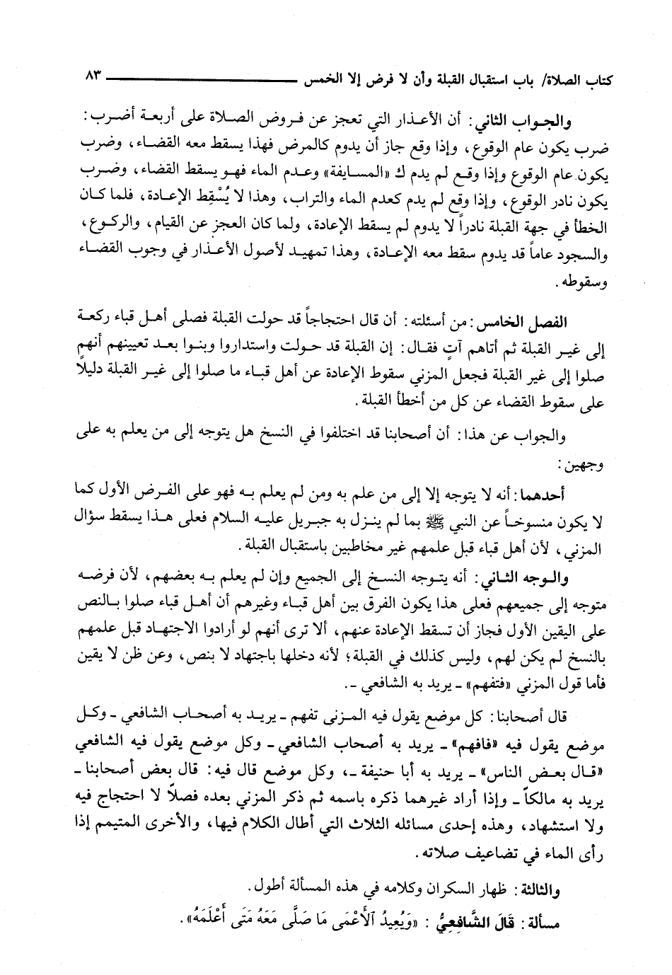 الفصل الخامس: من أسئلته: أَنْ قَالَ احْتِجَاجًا قَدْ حُوِّلَتِ الْقِبْلَةُ فَصَلَّى أَهْلُ قَبَاءٍ رَكْعَةً إِلَى غَيْرِ الْقِبْلَةِ ثُمَّ أَتَاهُمْ آتٍ فَقَالَ: إِنَّ الْقِبْلَةَ قَدْ حُوِّلَتْ وَاسْتَدَارُوا وَبَنَوْا بَعْدَ تَعْيِينِهِمْ أَنَّهُمْ صَلَّوْا إِلَى غَيْرِ الْقِبْلَةِ فَجَعَلَ الْمُزَنِيُّ سُقُوطَ الْإِعَادَةِ عَنْ أَهْلِ قِبَاءٍ مَا صَلَّوْا إِلَى غَيْرِ الْقِبْلَةِ دَلِيلًا عَلَى سُقُوطِ الْقَضَاءِ عَنْ كُلِّ مَنْ أَخْطَأَ الْقِبْلَةَ