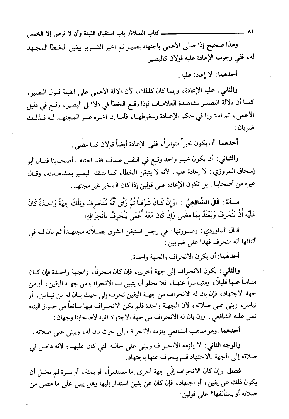 : وَإِنْ كَانَ الِانْحِرَافُ إِلَى جِهَةٍ أُخْرَى إِمَّا مُسْتَدْبِرًا، أَوْ يُمْنَةً، أَوْ يُسْرَةً لَمْ يَخْلُ أَنْ يَكُونَ ذَلِكَ عَنْ يَقِينٍ، أَوِ اجْتِهَادٍ، فَإِنْ كَانَ عَنْ يَقِينٍ اسْتَدَارَ إِلَيْهَا وَهَلْ يَبْنِي عَلَى مَا مَضَى مِنْ صَلَاتِهِ أَوْ يَسْتَأْنِفُهَا؟ عَلَى قَوْلَيْنِ: