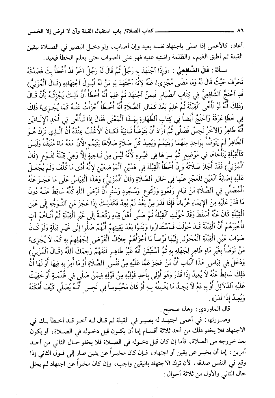 : قَالَ الشَّافِعِيُّ: " وَإِذَا اجْتَهَدَ بِهِ رَجُلٌ ثُمَّ قَالَ لَهُ رَجُلٌ آَخَرُ قَدْ أَخْطَأَ بِكَ فَصَدَّقَهُ تَحَرَّفَ حَيْثُ قَالَ لَهُ وَمَا مَضَى مُجْزِئٌ عَنْهُ لِأَنَّهُ اجْتَهَدَ بِهِ مَنْ لَهُ قبول اجتهاده (قال المزني) قد احتج الشافعي في كتاب الصيام فيمن اجتهد ثم علم أنه أخطأ أن ذلك يجزئه بأن قال وذلك أنه لو تَأَخَّى الْقِبْلَةَ ثُمَّ عَلِمَ بَعْدَ كَمَالِ الصَّلَاةِ أنه أخطأ أجزأت عنه كما يجزئ ذلك في خطإ عرفة واحتج أيضاً في كتاب الطهارة بهذا المعنى فقال إِذَا تَأَخَّى فِي أَحَدِ الْإِنَاءَيْنِ أَنَّهُ طَاهِرٌ والآخر نجس فصلى ثم أراد أن يتوضأ ثانية فكان الأغلب عنده أن الذي ترك هُوَ الطَّاهِرُ لَمْ يَتَوَضَّأْ بِوَاحِدٍ مِنْهُمَا وَيَتَيَمَّمُ ويعيد كل صلاة صلاها بتيمم لأن معه ماء متيقناً وليس كالقبلة يتأخاها في موضع ثم يراها في غيره لِأَنَّهُ لَيْسَ مِنْ نَاحِيَةٍ إِلَّا وَهِيَ قِبْلَةٌ لقوم (قال المزني) فقد أجاز صلاته وإن أخطأ القبلة فِي هَذَيْنِ الْمَوْضِعَيْنِ لِأَنَّهُ أَدَّى مَا كُلِّفَ وَلَمْ يَجْعَلْ عَلَيْهِ إِصَابَةَ الْعَيْنِ لِلْعَجْزِ عَنْهَا في حال الصلاة (قال المزني) وهذا القياس على ما عجز عنه المصلي فِي الصَّلَاةِ مِنْ قِيَامٍ وَقُعُودٍ وَرُكُوعٍ وَسُجُودٍ وستر أن فرض الله كله ساقط عنه دون ما قدر عليه من الإيماء عرياناً فإذا قدر من بعد لم يعد فكذلك إذا عجز عن التوجه إلى عين القبلة كان عنه أسقط وقد حولت القبلة ثم صلى أَهْلُ قَبَاءٍ رَكْعَةً إِلَى غَيْرِ الْقِبْلَةِ ثُمَّ أتاهم آتٍ فأخبرهم أن القبلة قد حولت فاستداروا وبنوا بعد يقينهم أنهم صلوا إلى غير قبلة ولو كان صواب عين القبلة المحول إليها فرضاً ما أجزأهم خلاف الفرض لجهلهم به كما لا يجزئ من توضأ بغير ماءٍ طاهرٍ لجهله به ثم استيقن أنه غير طاهر فتفهم رحمك الله (قال المزني) ودخل في قياس هذا الباب أن من عجز عما عليه من نفس الصلاة أو ما أمر به فيها أو لها أن ذلك ساقط عنه لا يعيد إذا قدر وهو أولى بأحد قوليه من قوله فيمن صلى في ظلمة أو خفيت عليه الدلائل أو به دم لا يجد ما يغسله به أو كان محبوساً في نجسٍ أنه يصلي كيف أمكنه ويعيد إذا قدر "